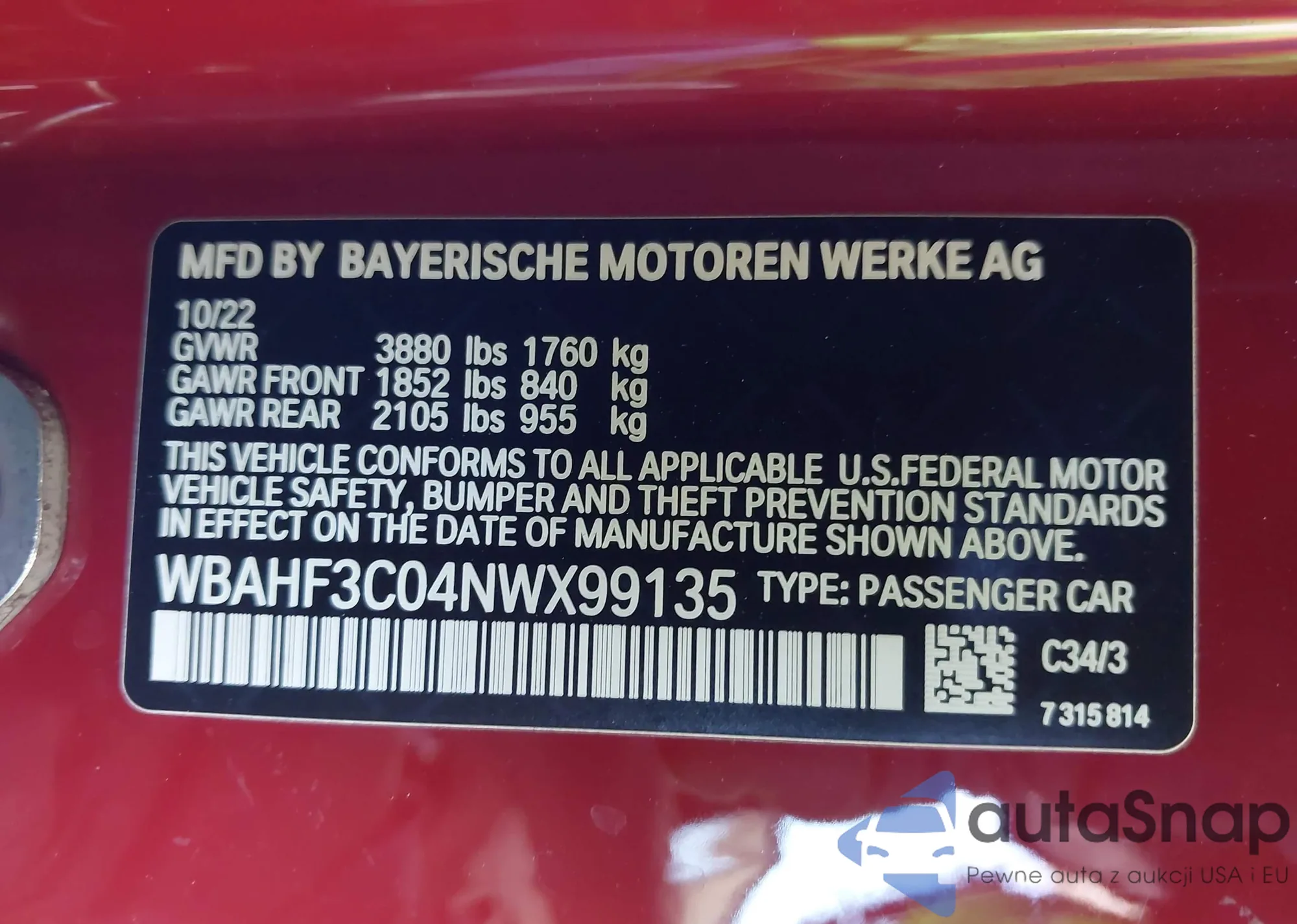 LOT: 43045356 VIN: WBAHF3C04NWX99135