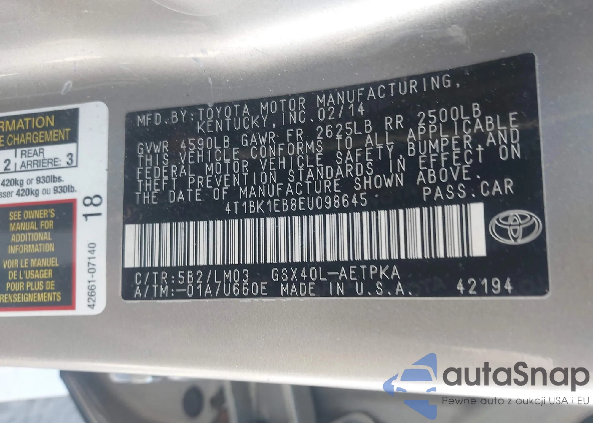 LOT: 43249609 VIN: 4T1BK1EB8EU098645