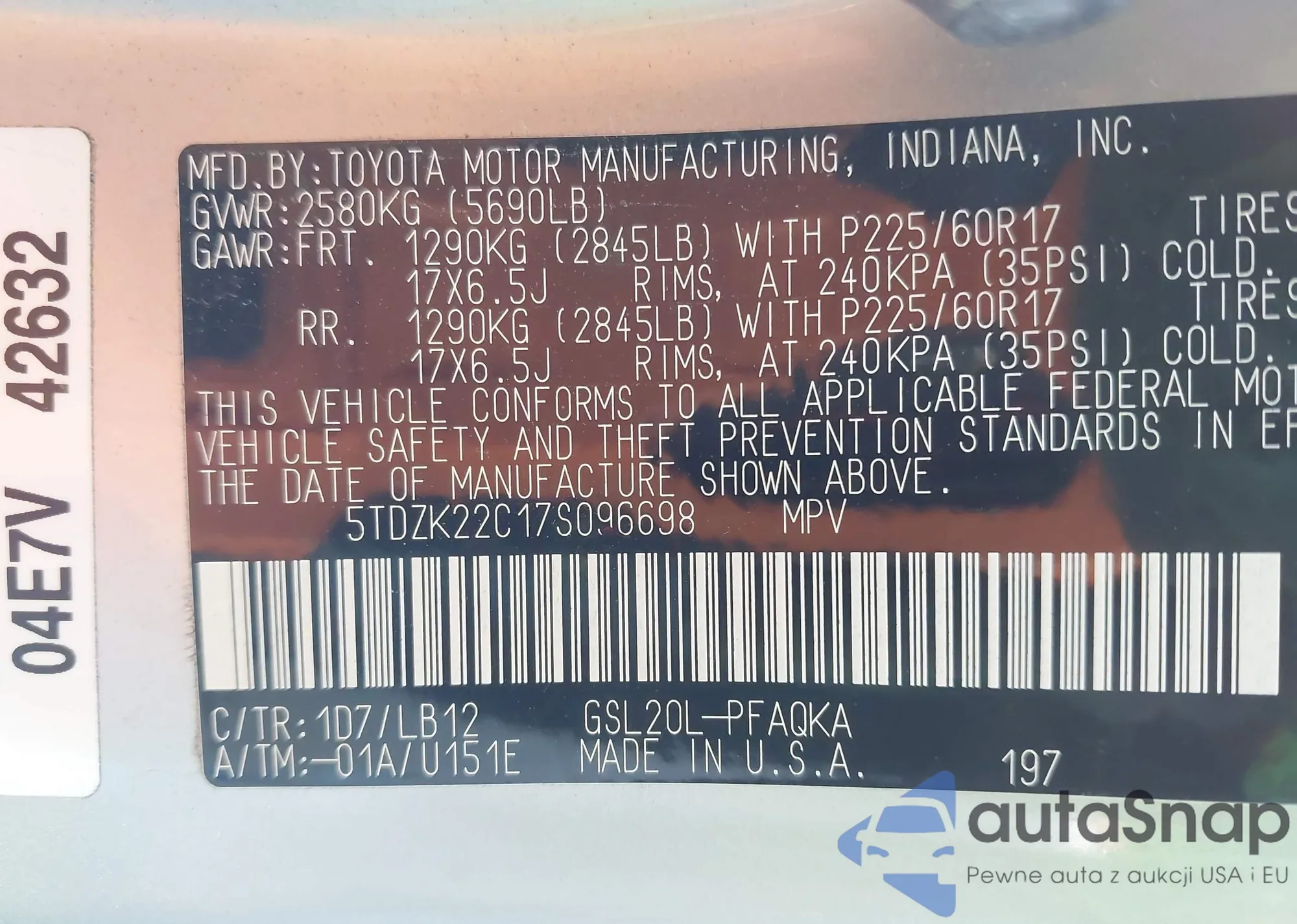 LOT: 43011813 VIN: 5TDZK22C17S096698