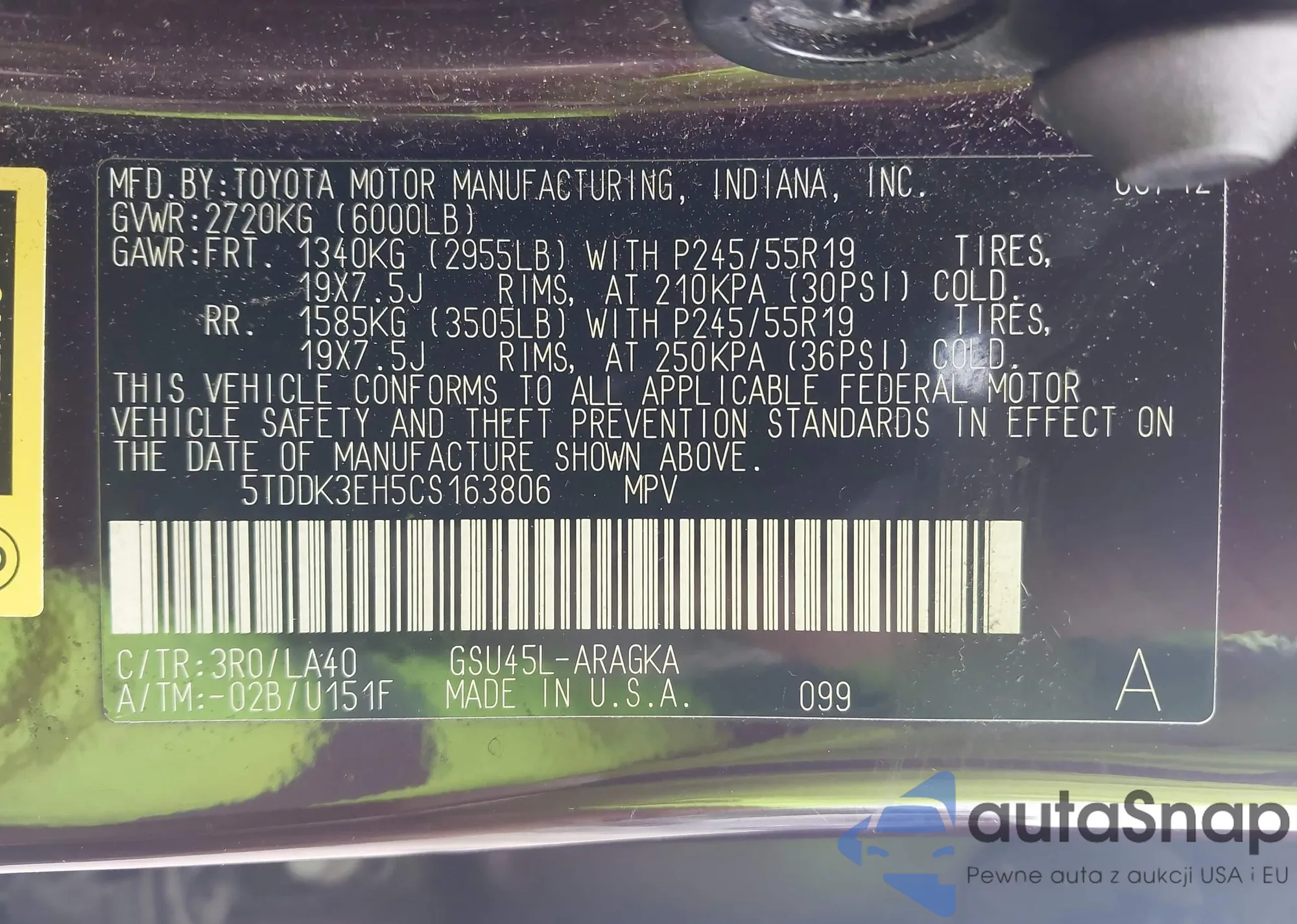 LOT: 42999767 VIN: 5TDDK3EH5CS163806