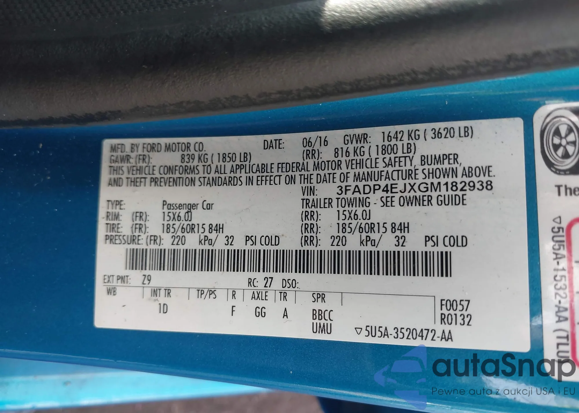 • VIN 3FADP4EJXGM182938
