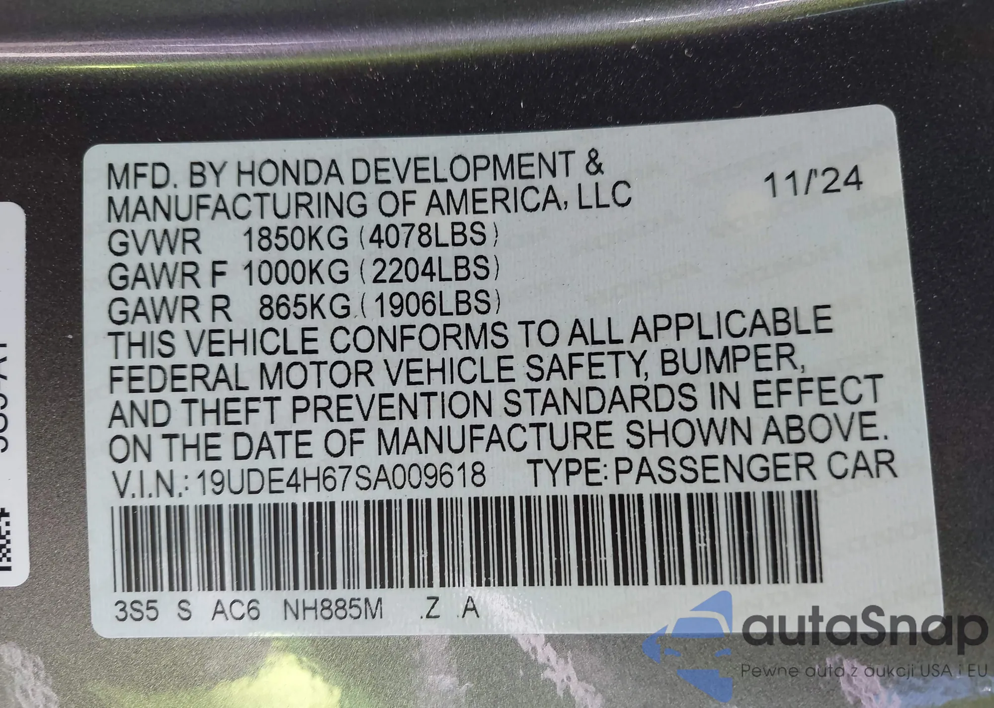 • VIN 19UDE4H67SA009618