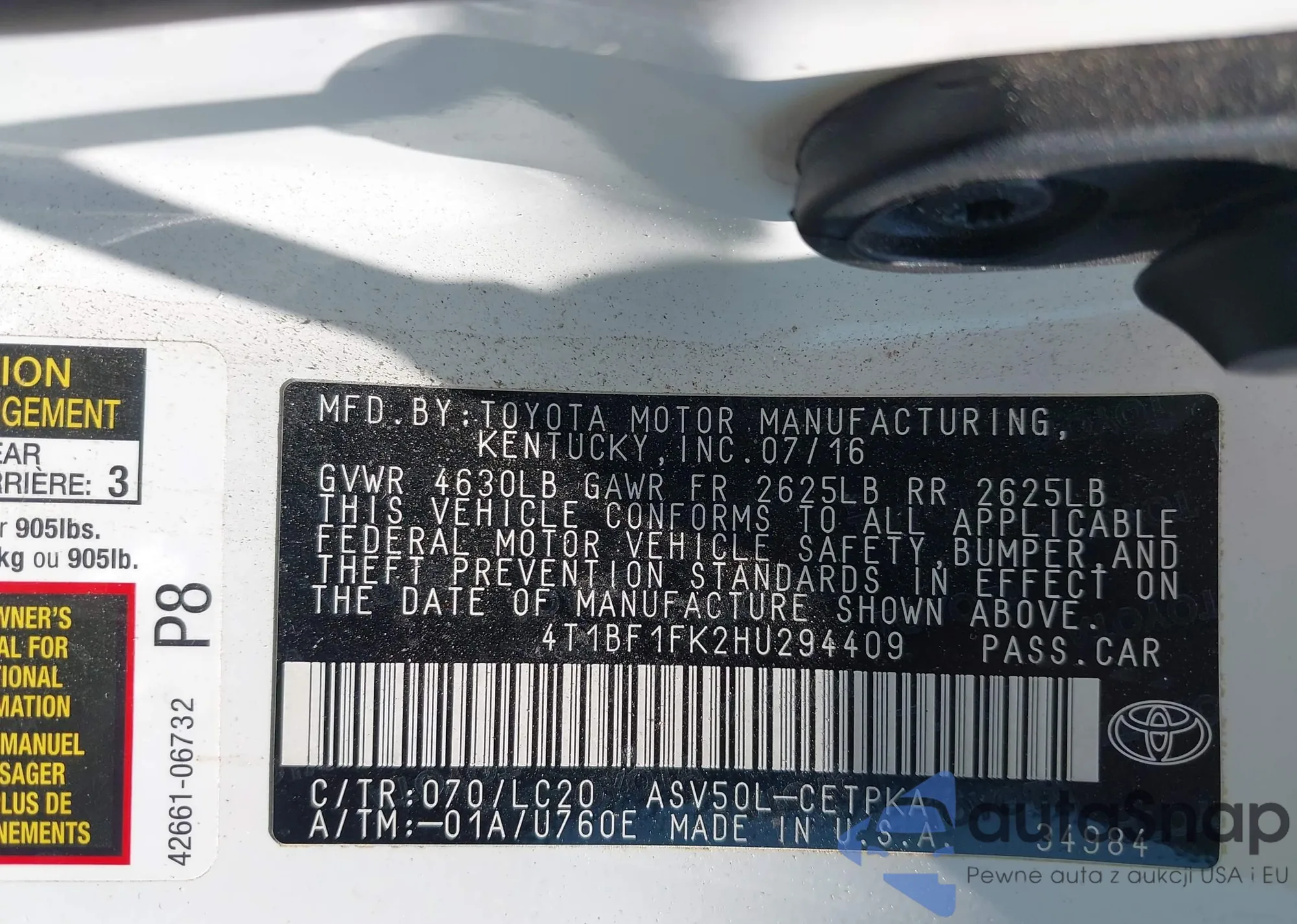 • VIN 4T1BF1FK2HU294409