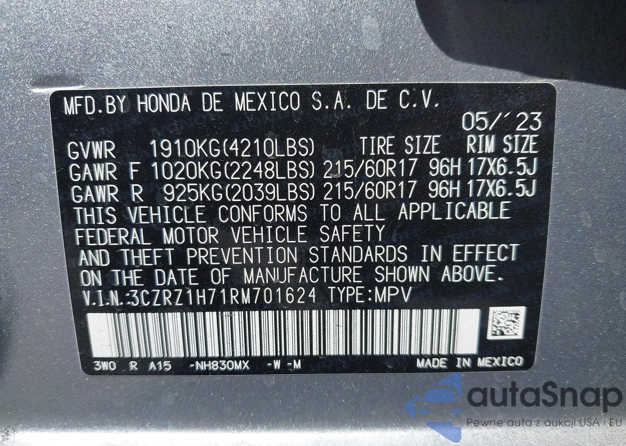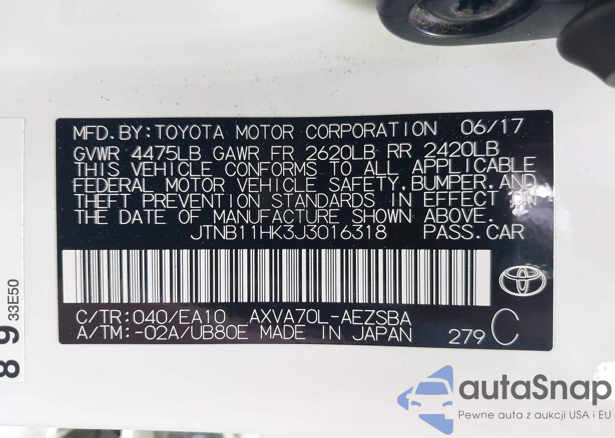 LOT: 42910001 VIN: 19UDE4H67SA009618