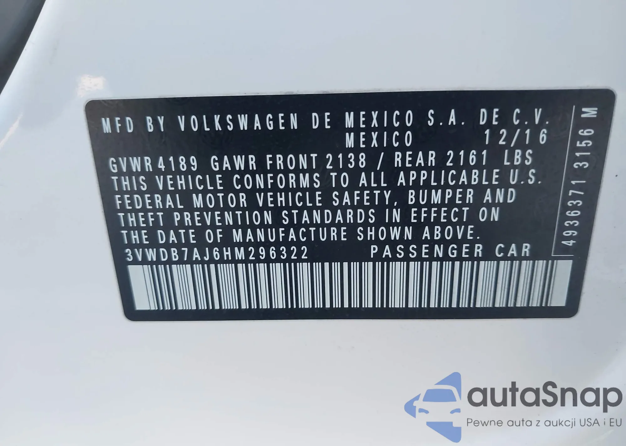 • VIN 3VWDB7AJ6HM296322
