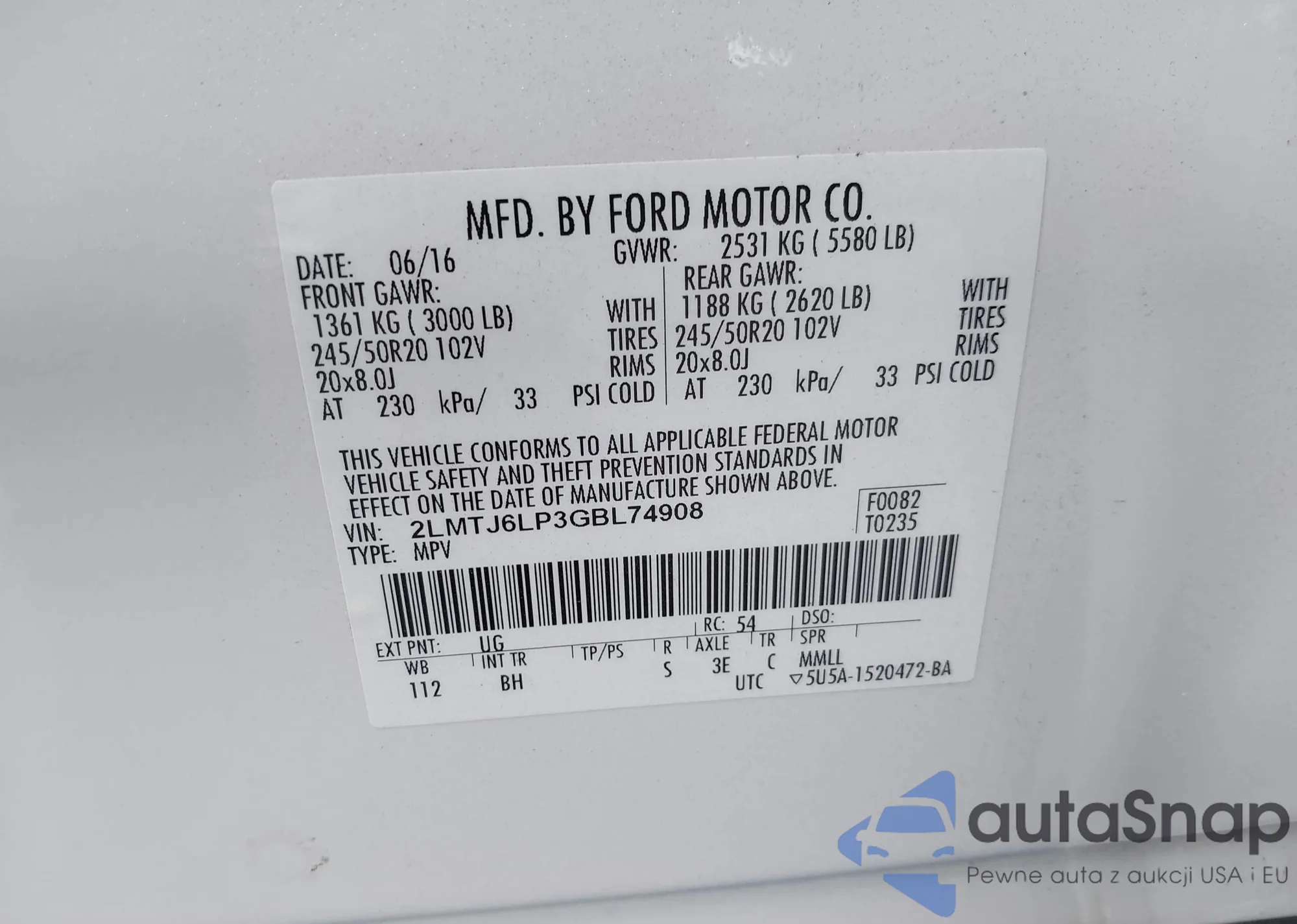 LOT: 43311963 VIN: 2LMTJ6LP3GBL74908
