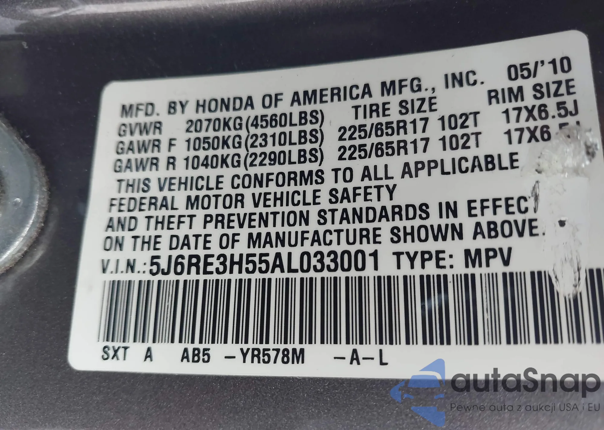 • VIN 5J6RE3H55AL033001