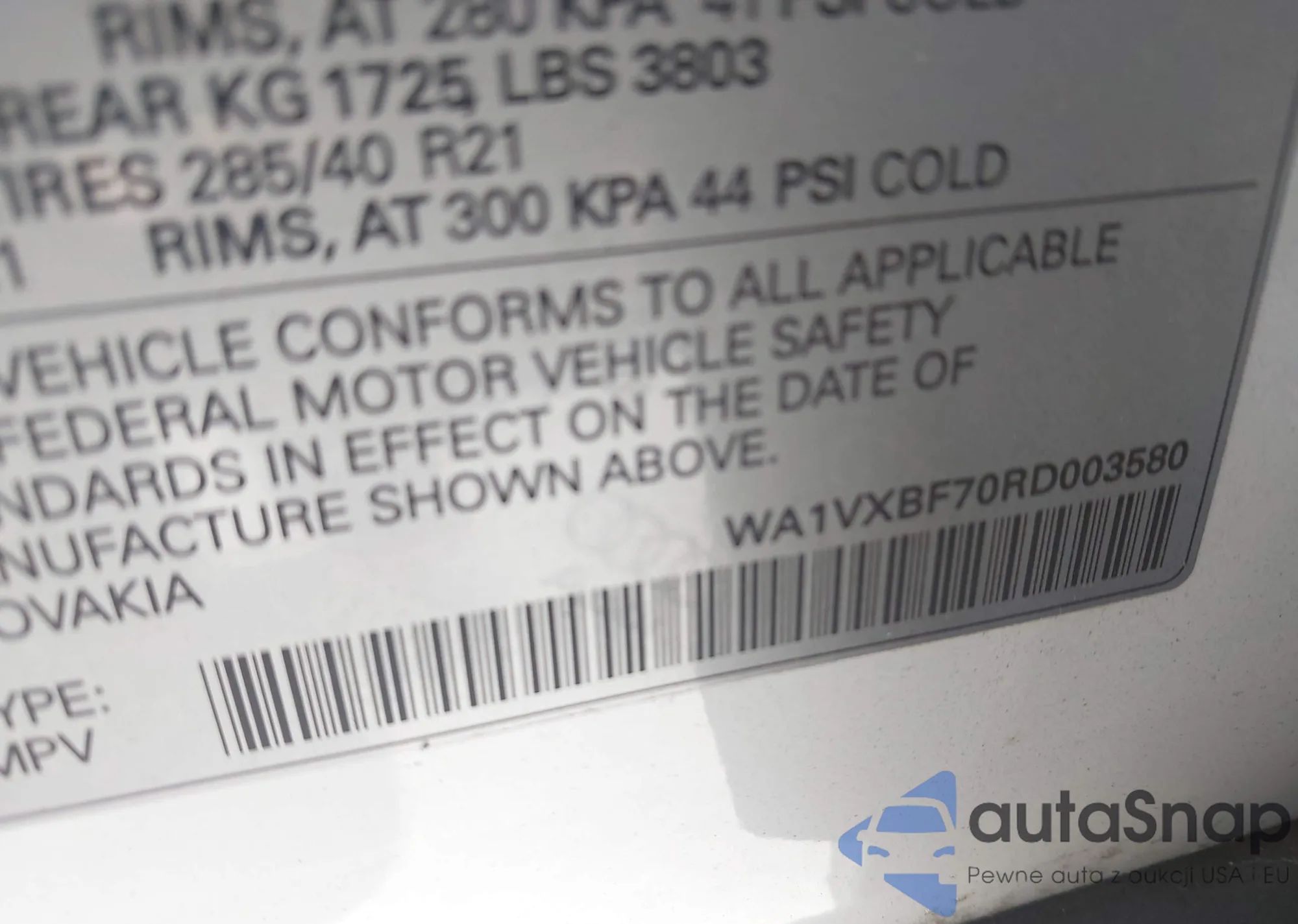 LOT: 43085820 VIN: WA1VXBF70RD003580