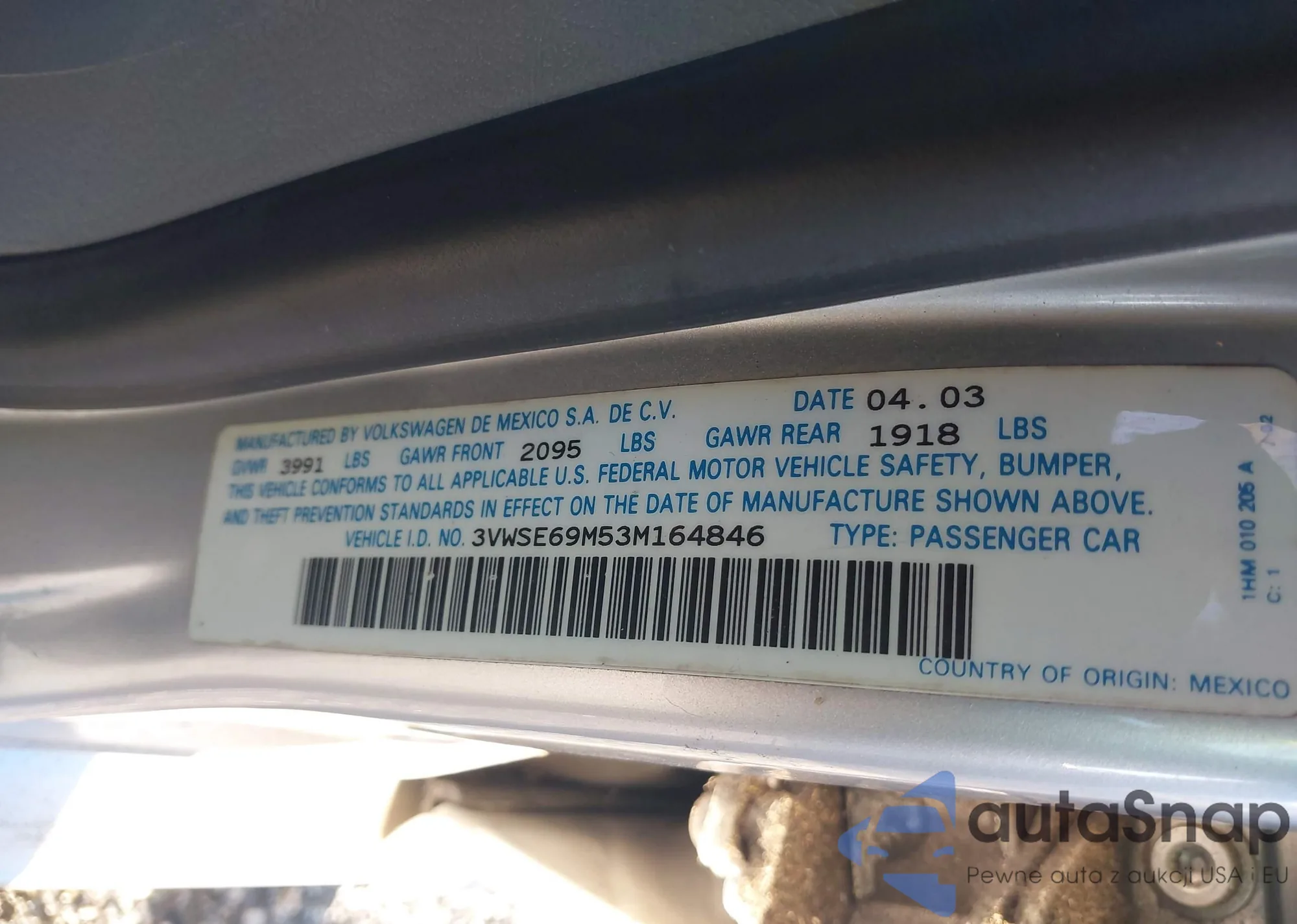 • VIN 3VWSE69M53M164846