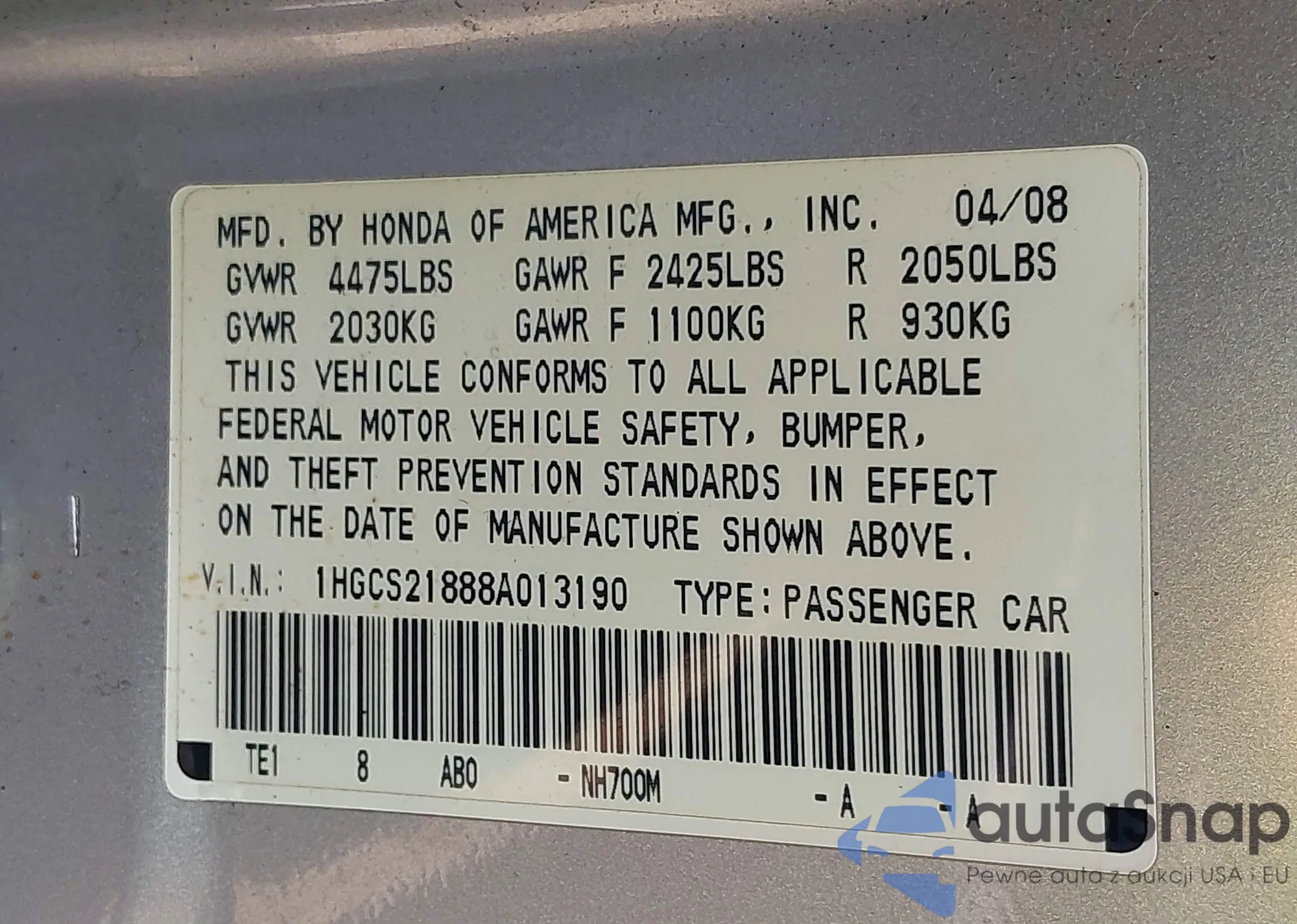 LOT: 42959769 VIN: 1HGCS21888A013190
