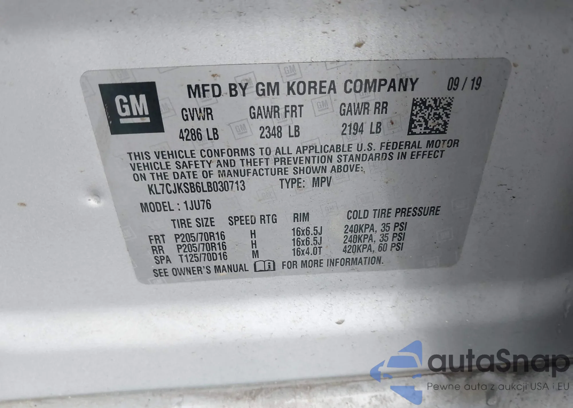 LOT: 42963486 VIN: KL7CJKSB6LB030713