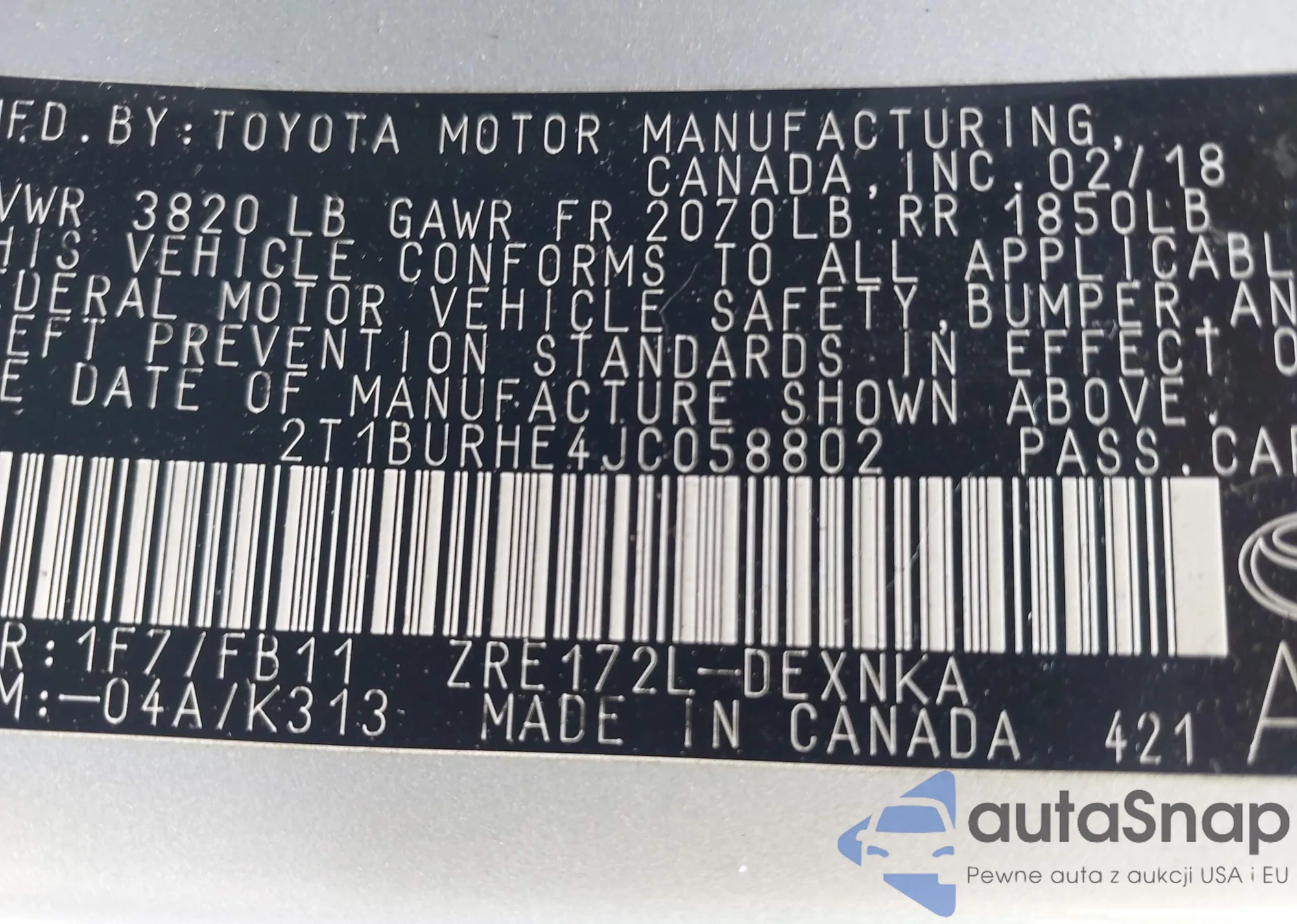 • VIN 2T1BURHE4JC058802
