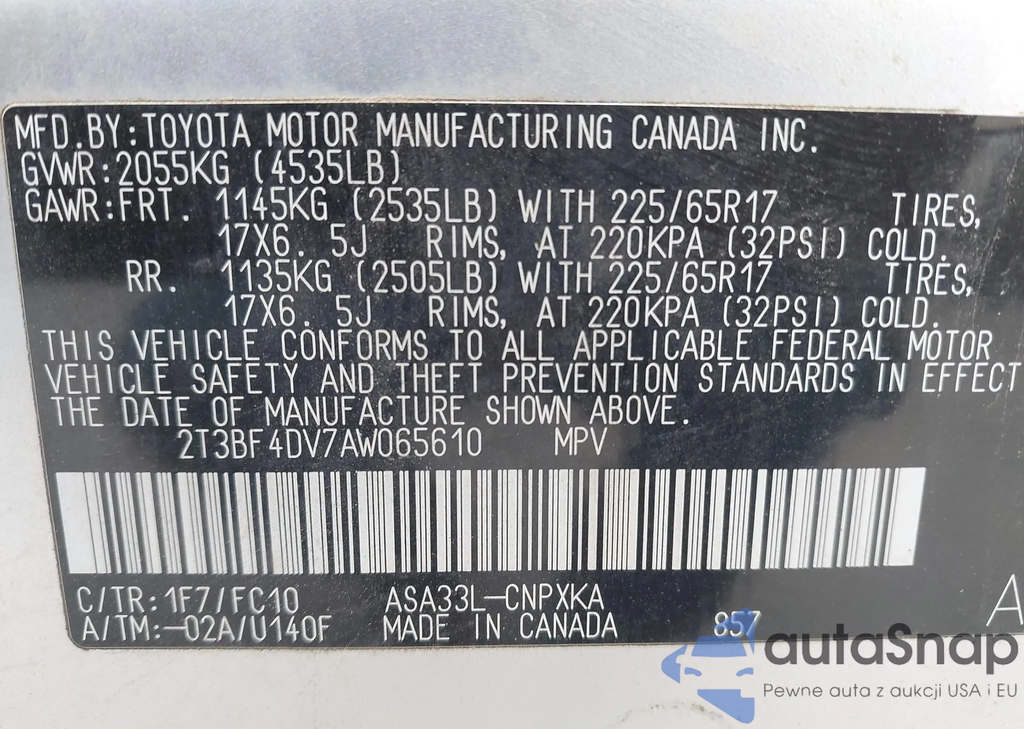 • VIN 2T3BF4DV7AW065610