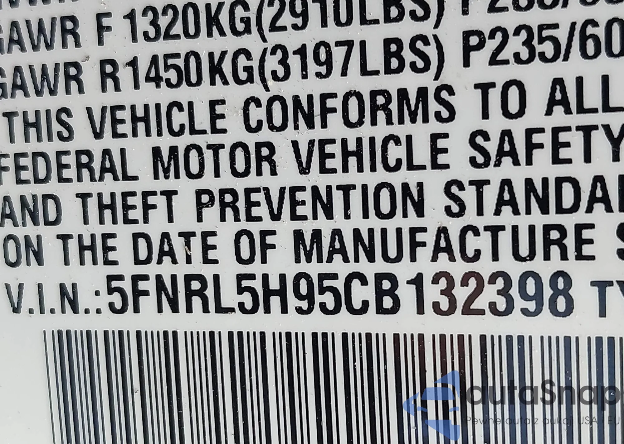 • VIN 5FNRL5H95CB132398