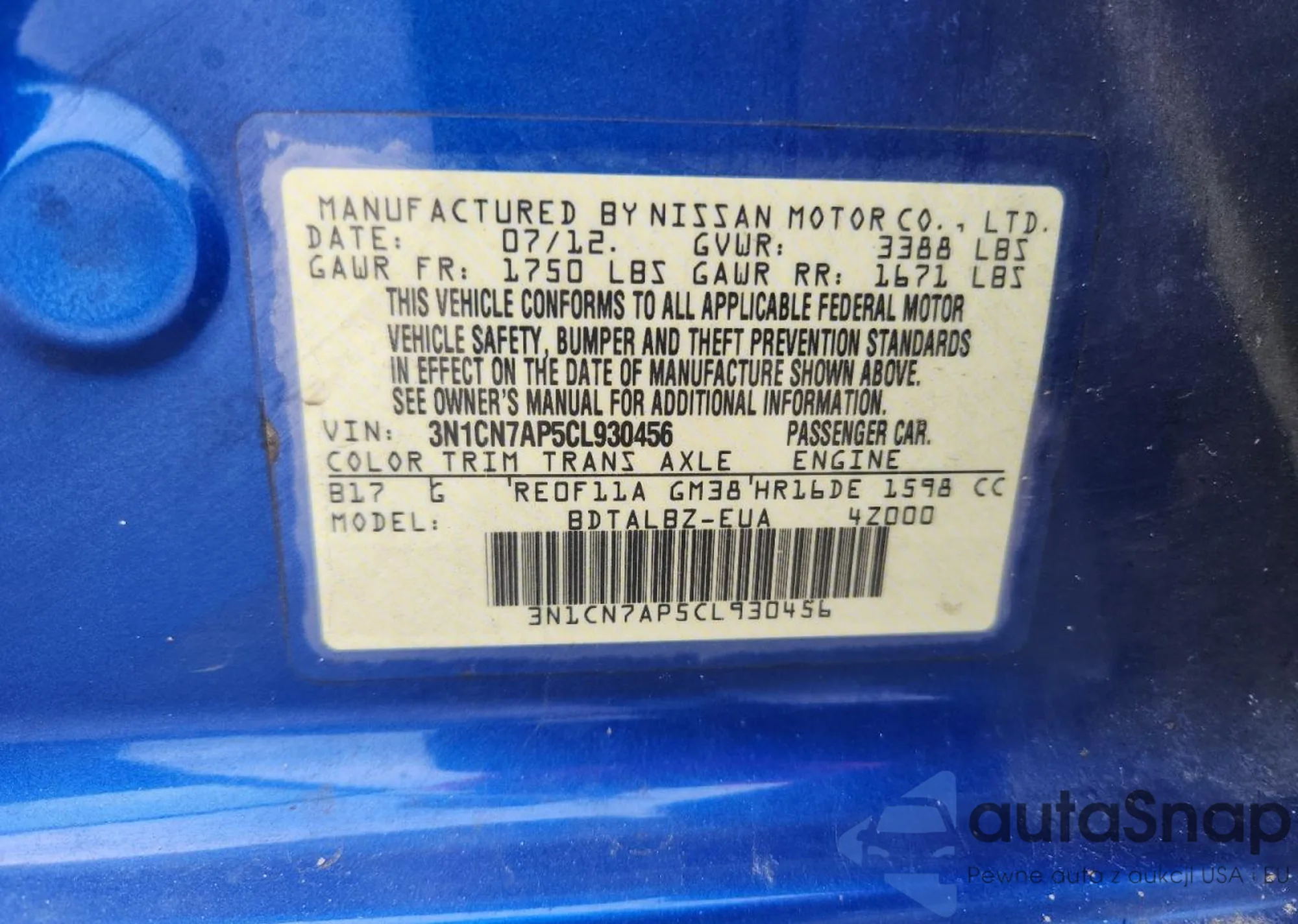 • VIN 3N1CN7AP5CL930456