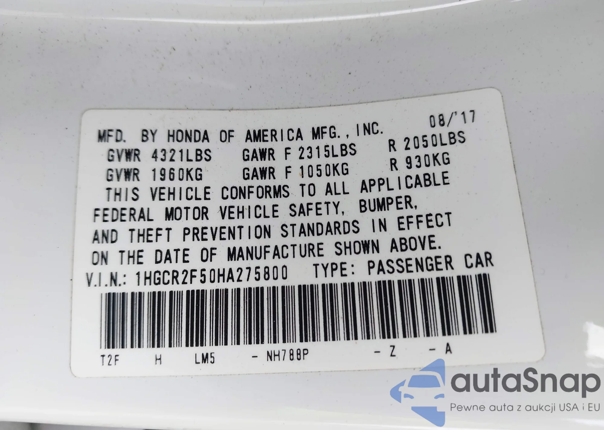 LOT: 43049446 VIN: 1HGCR2F50HA275800