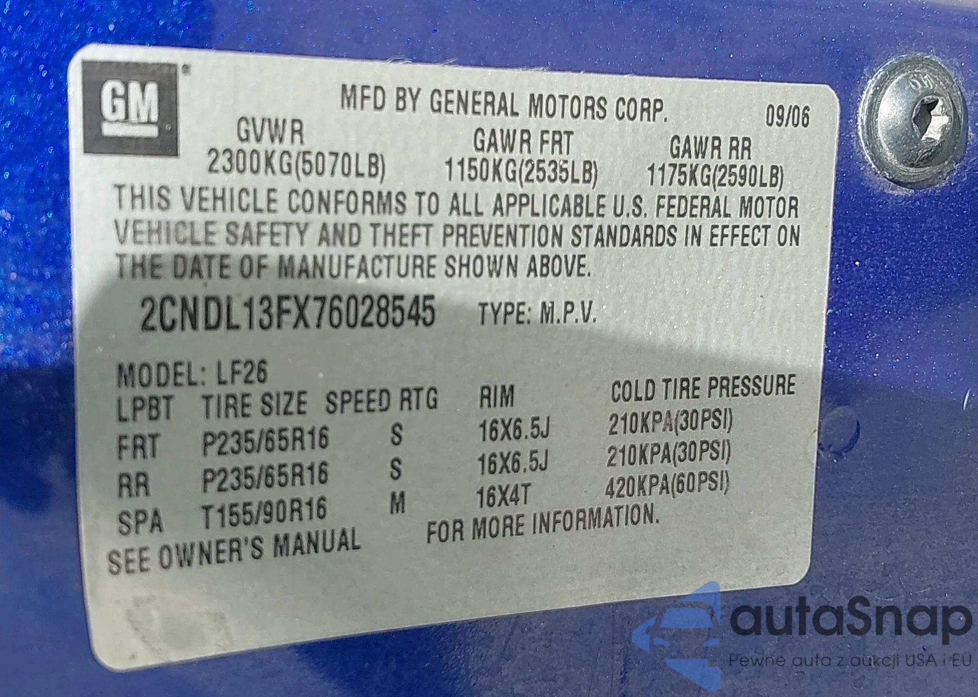 LOT: 43266081 VIN: 2CNDL13FX76028545