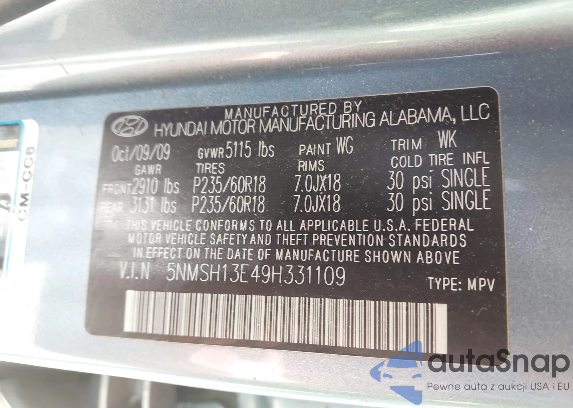 LOT: 43123557 VIN: 5NMSH13E49H331109