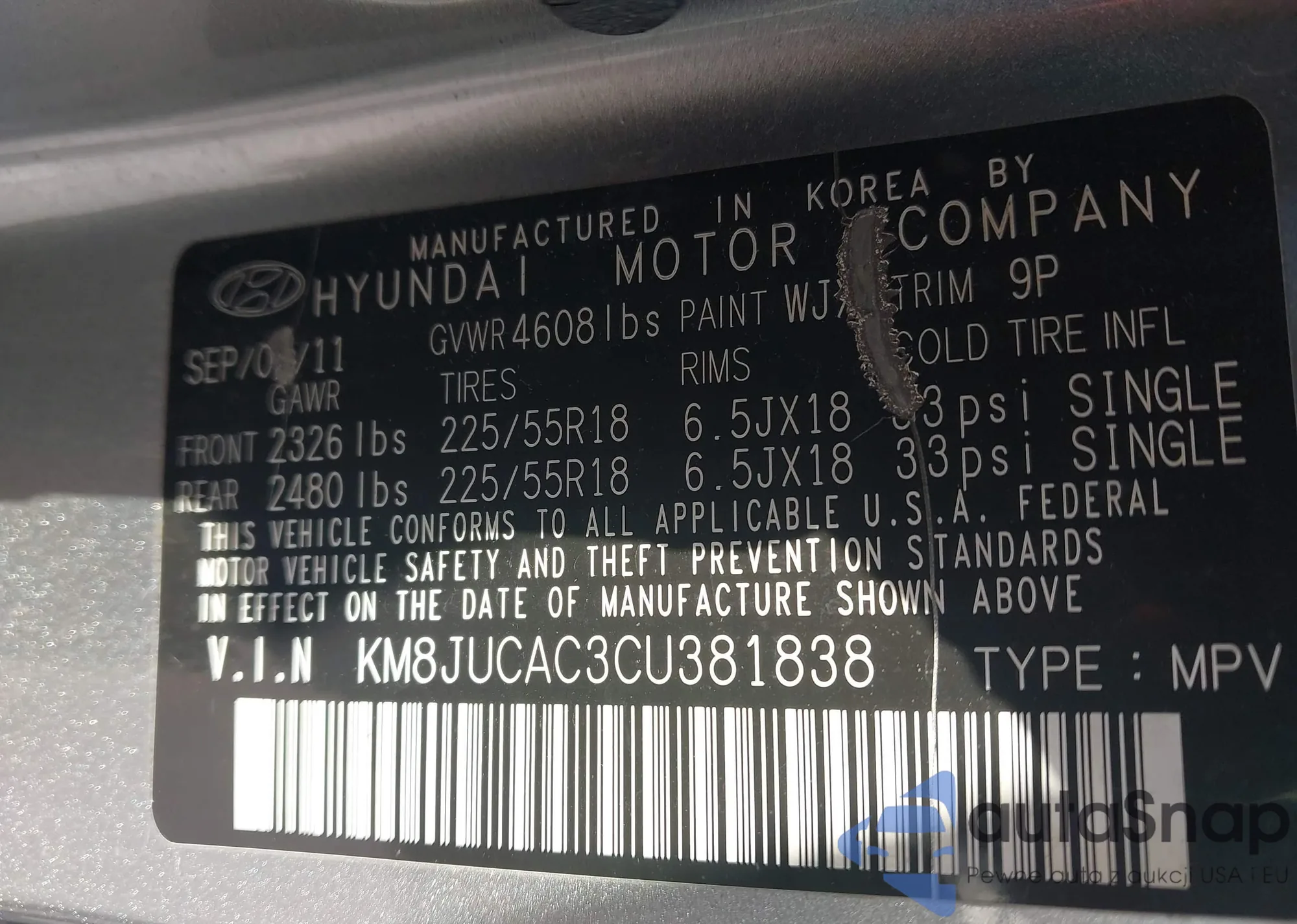 LOT: 42871030 VIN: KM8JUCAC3CU381838