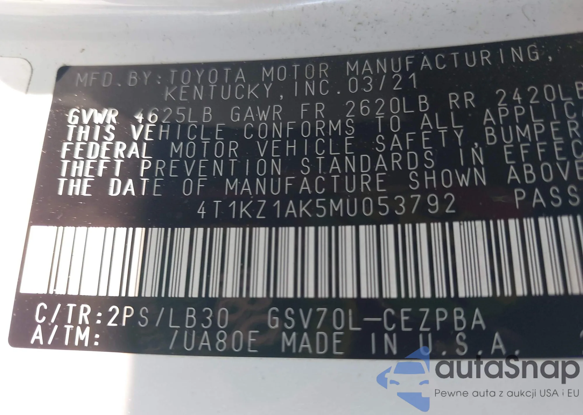 LOT: 43225821 VIN: 4T1KZ1AK5MU053792