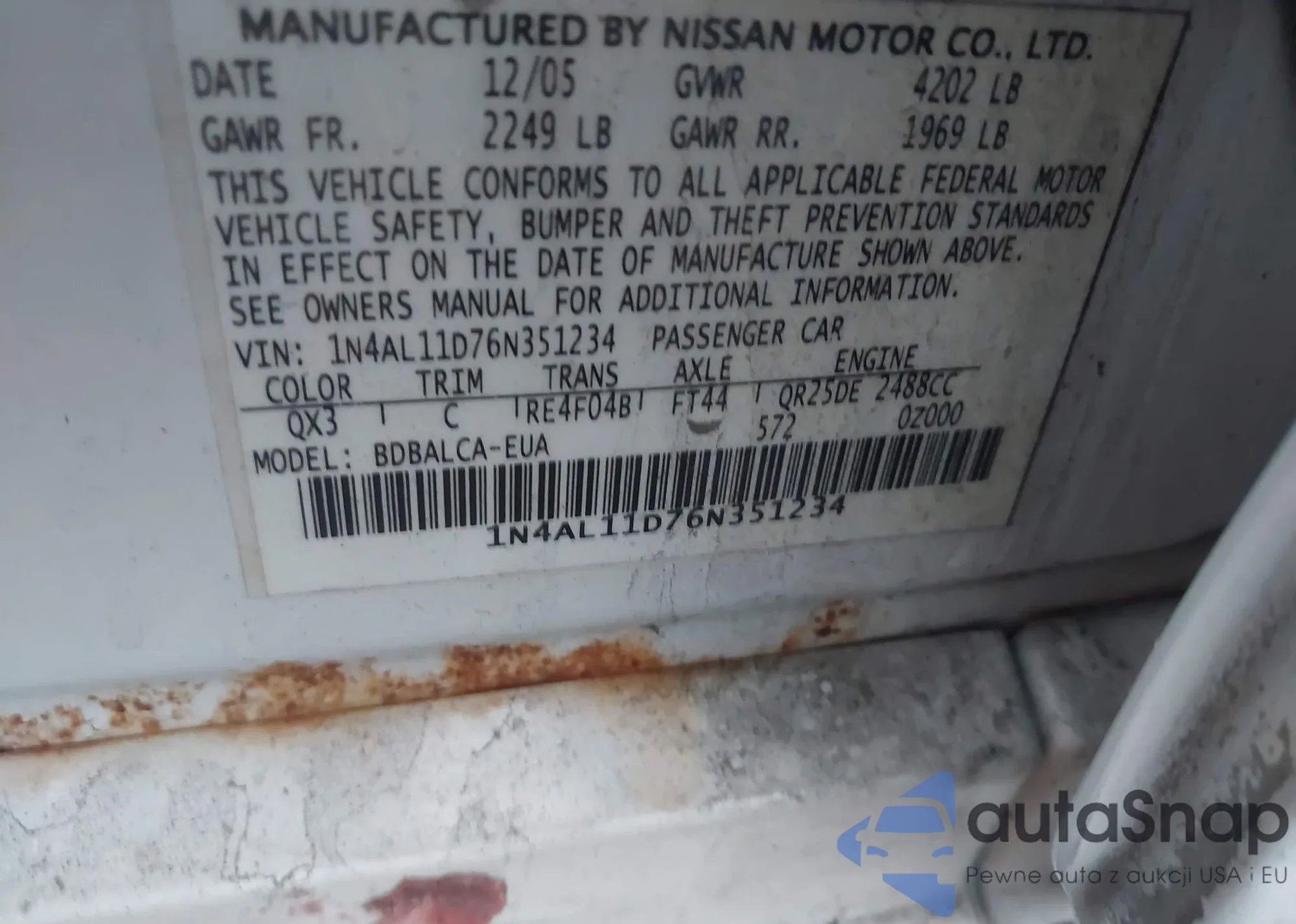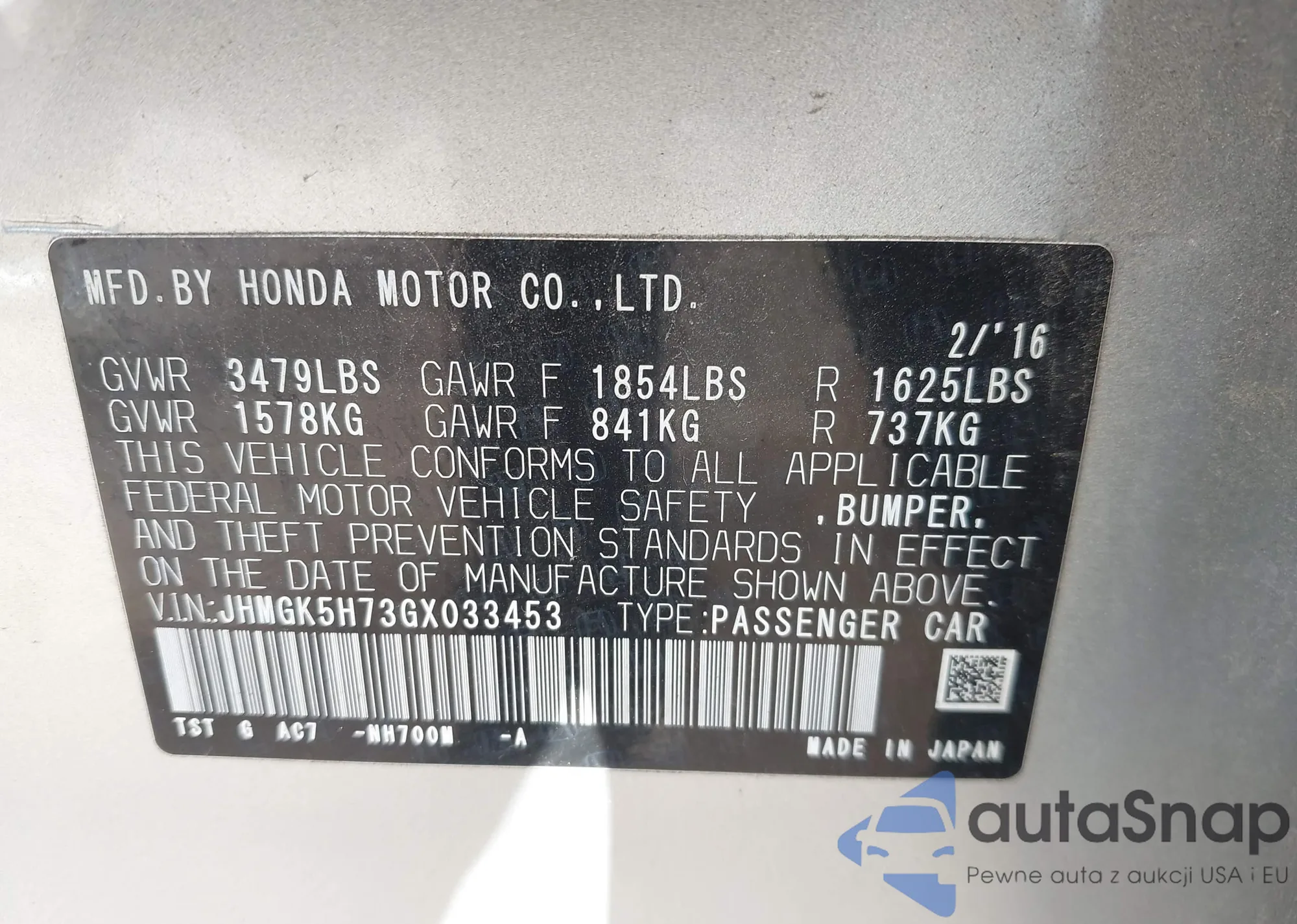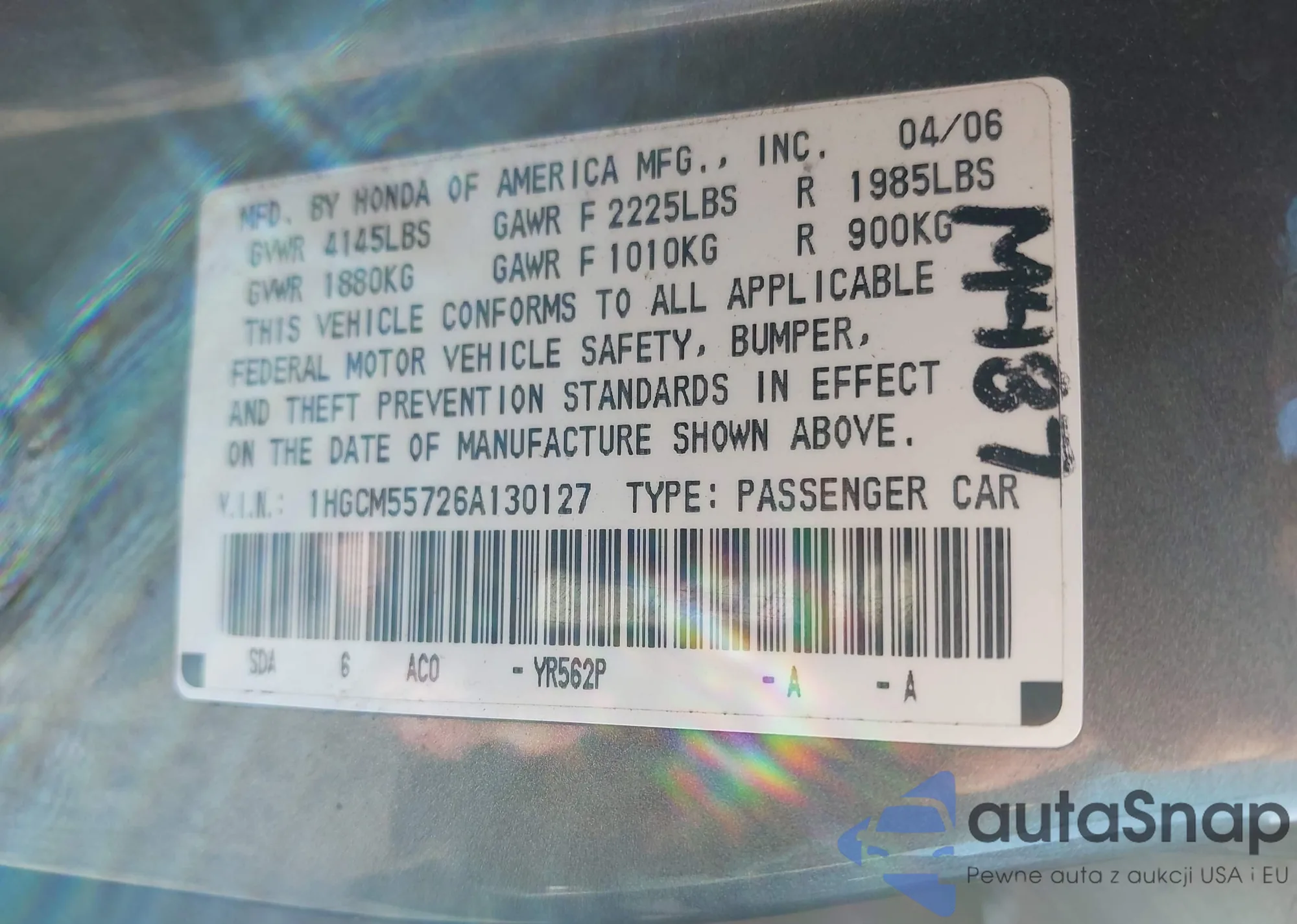 LOT: 43171762 VIN: 1HGCM55726A130127