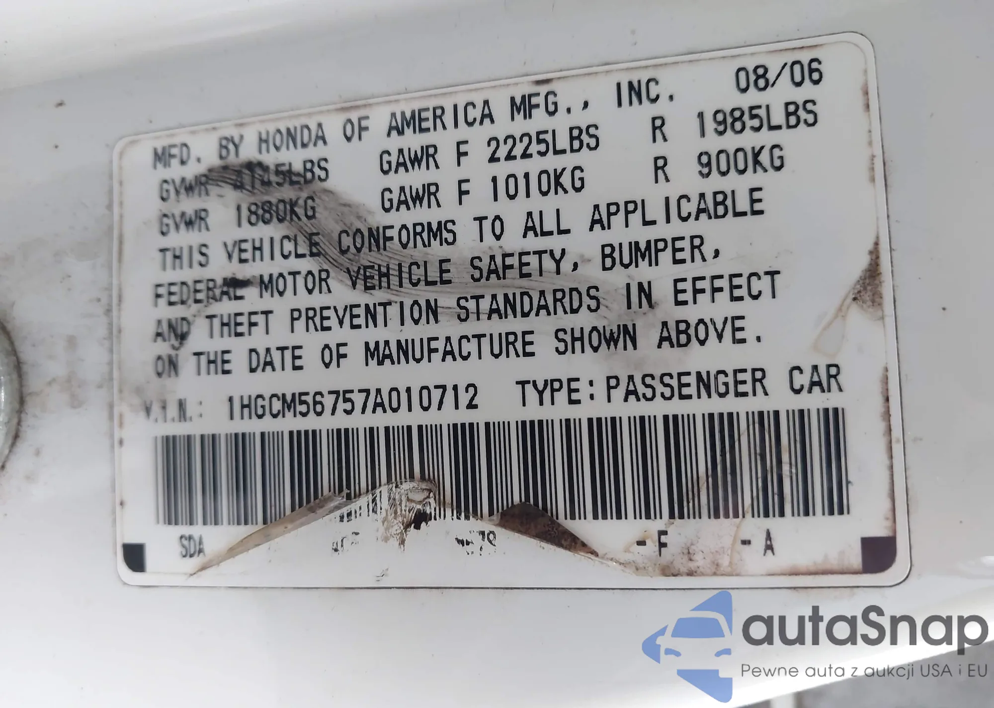 LOT: 43190152 VIN: 1HGCM56757A010712