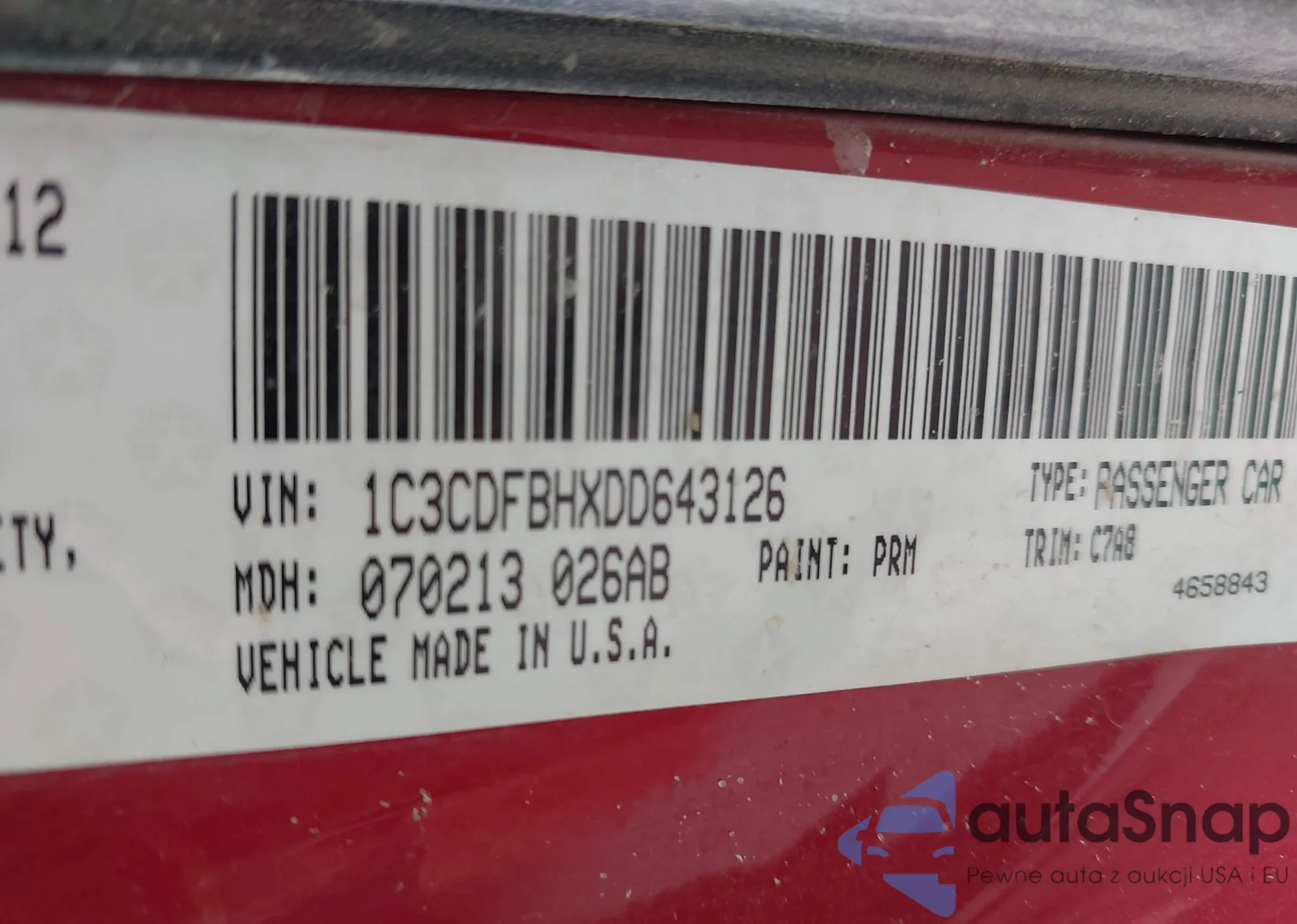 LOT: 42297255 VIN: 1C3CDFBHXDD643126