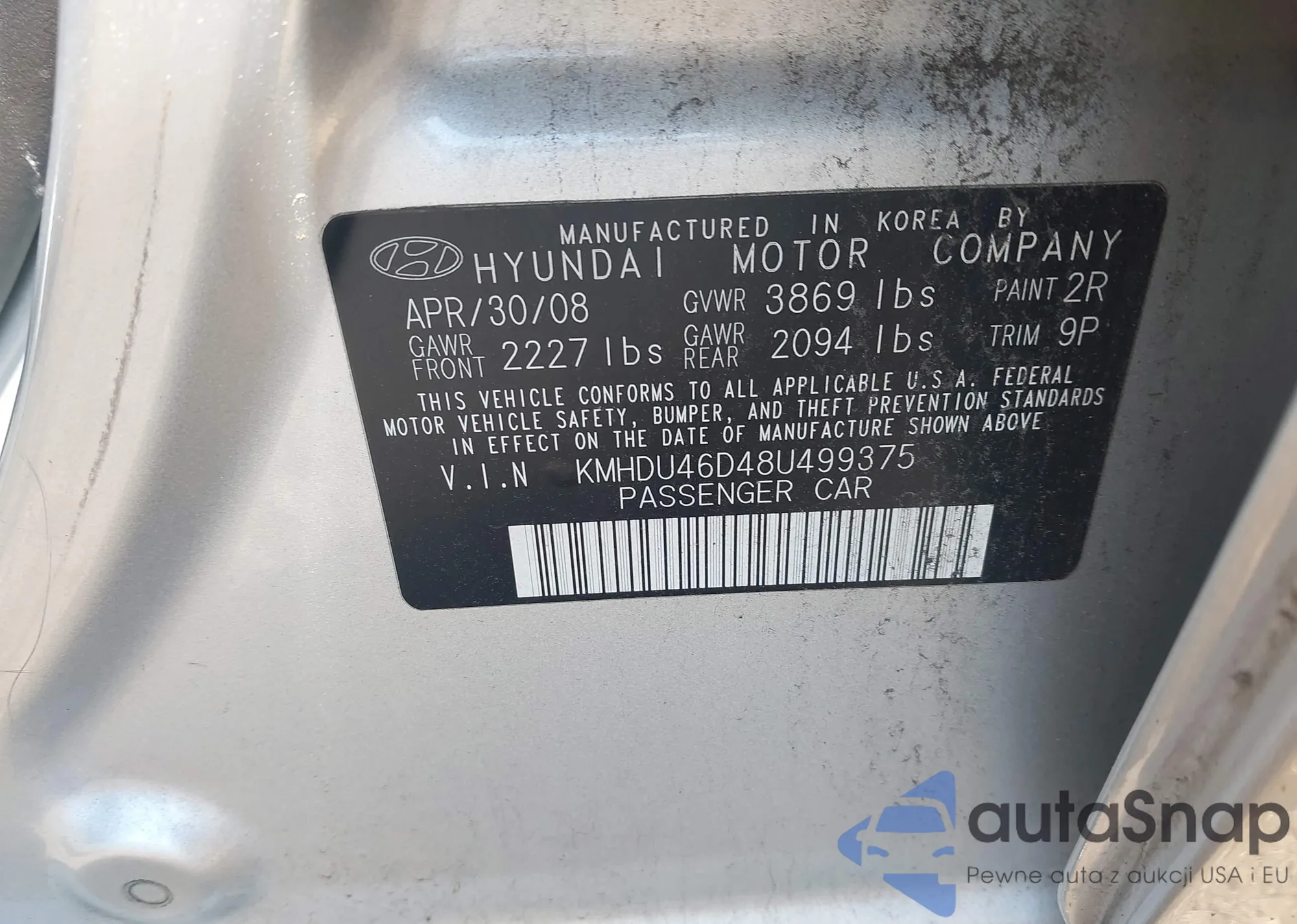 LOT: 42542383 VIN: KMHDU46D48U499375