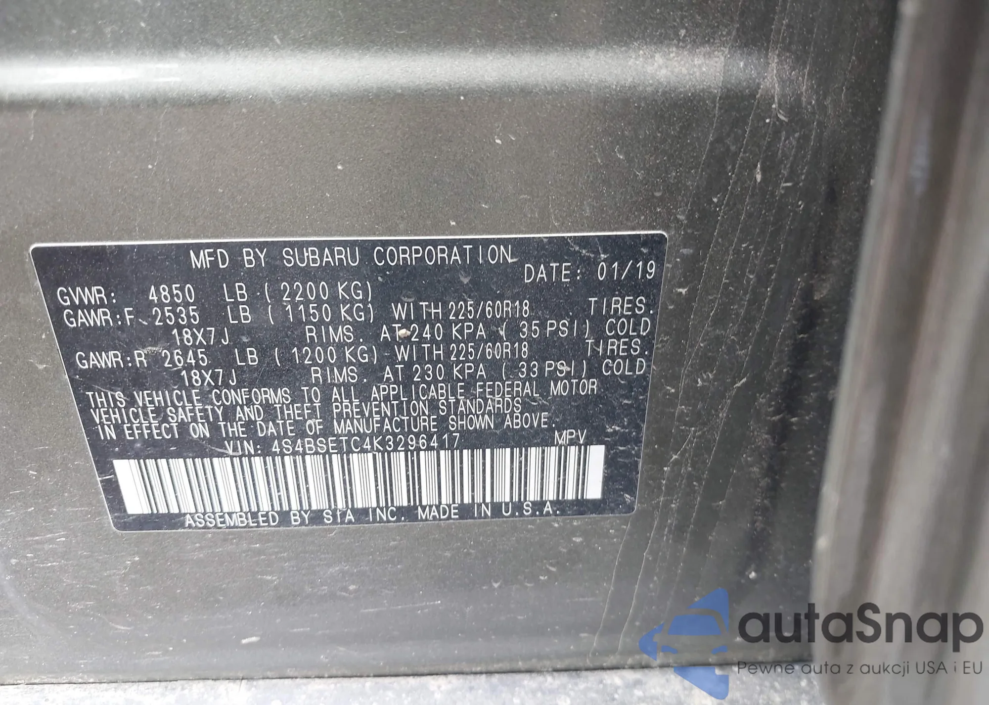• VIN 4S4BSETC4K3296417