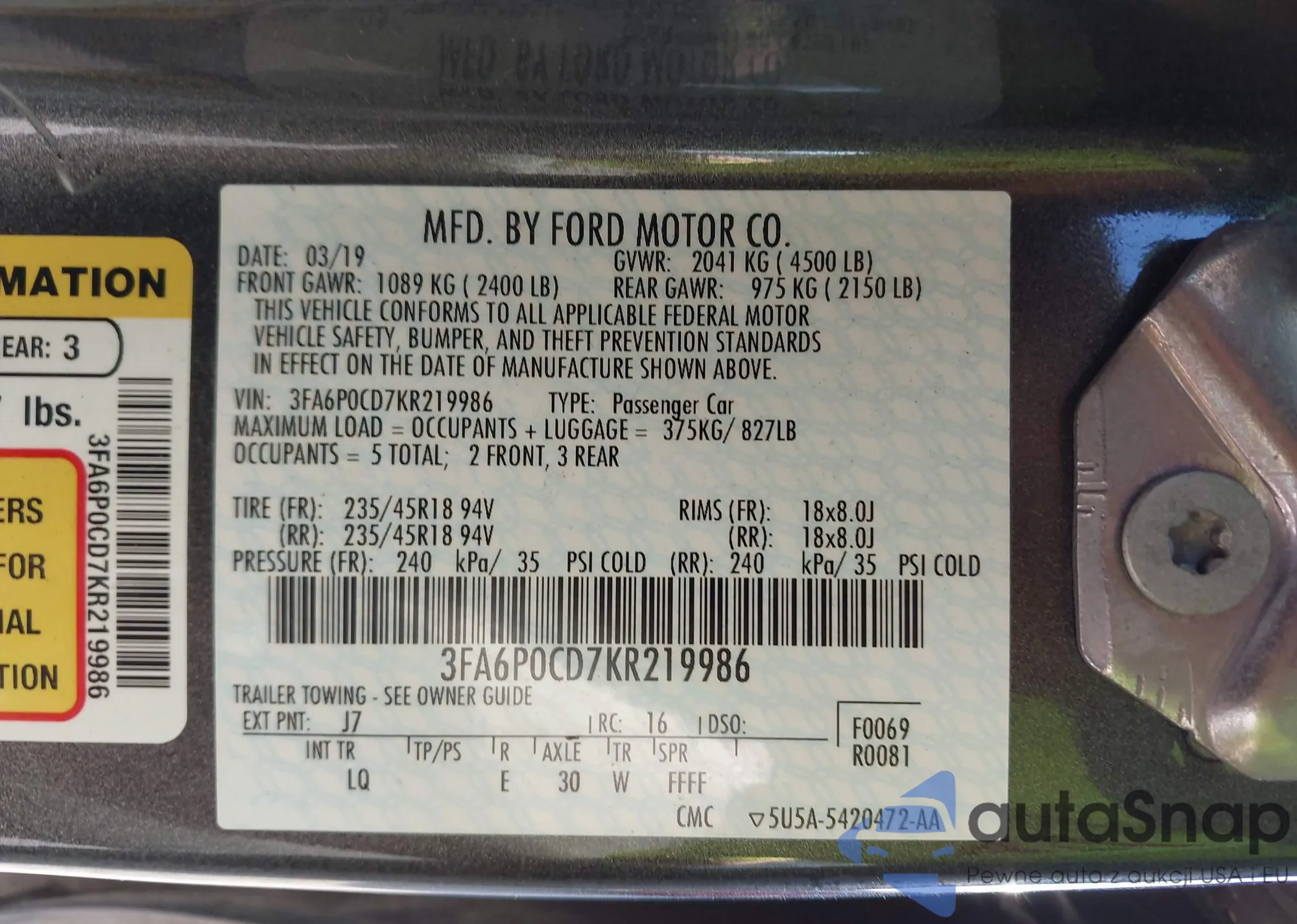 LOT: 43205813 VIN: 3FA6P0CD7KR219986