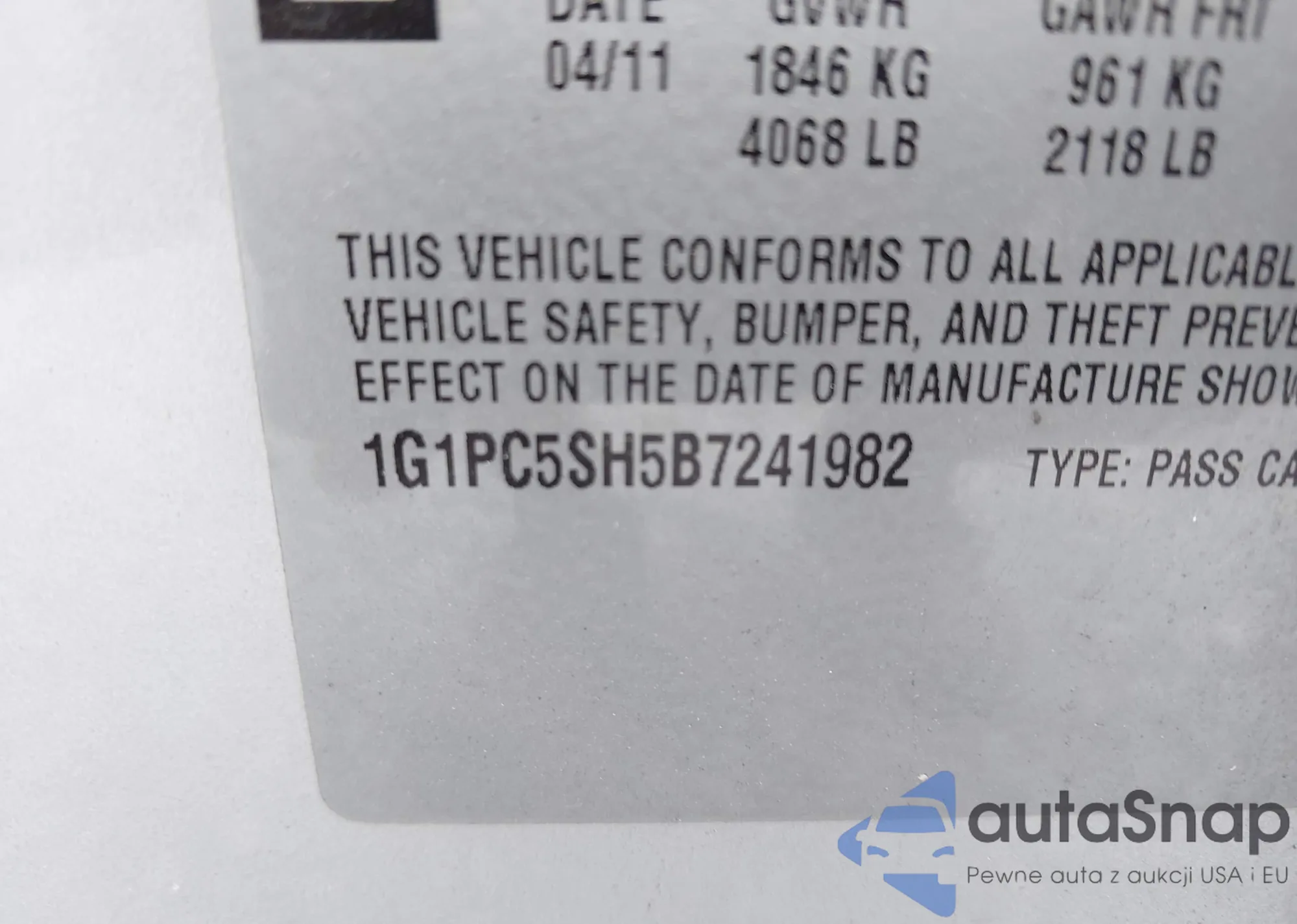 LOT: 43007005 VIN: 1G1PC5SH5B7241982
