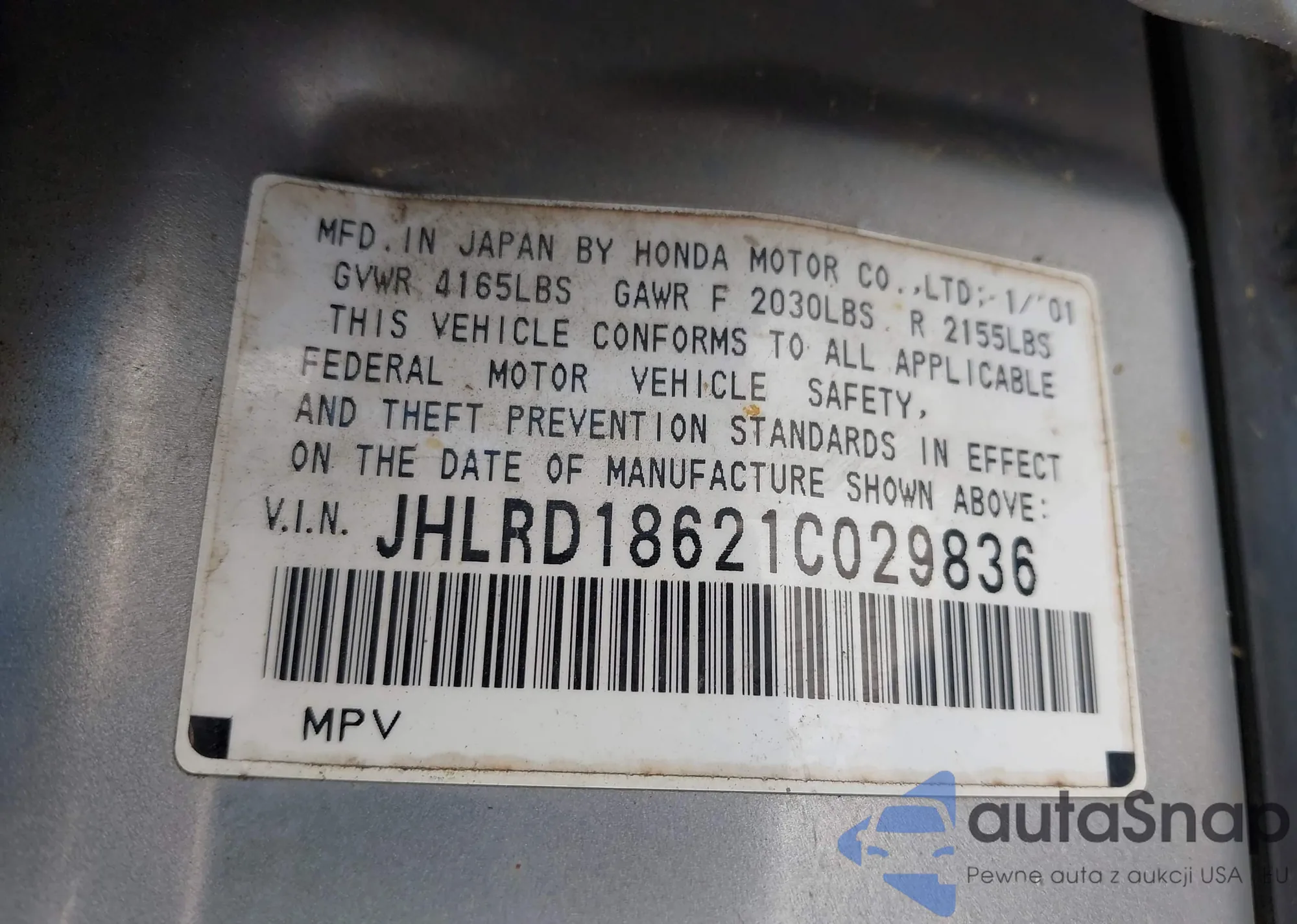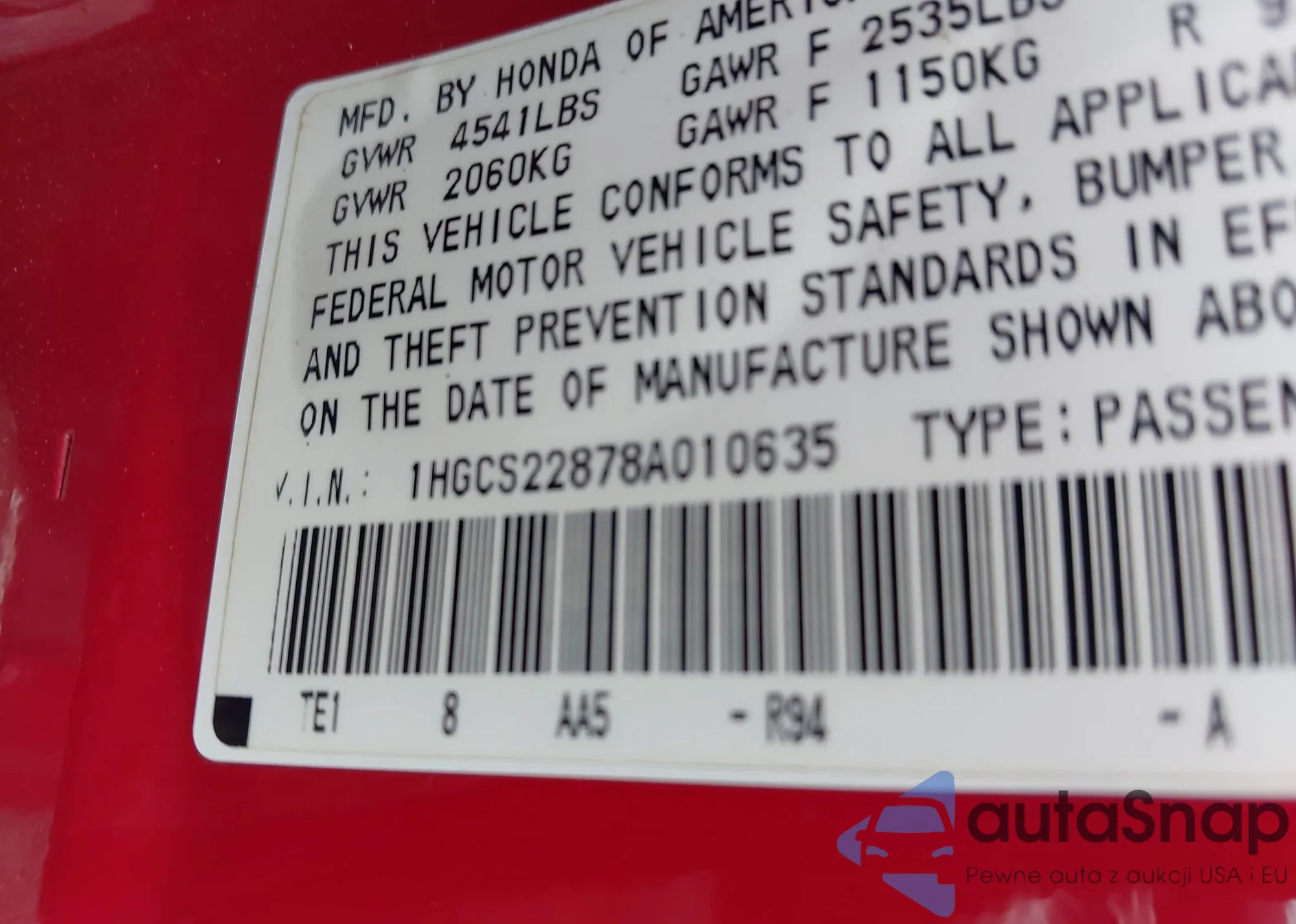 LOT: 43105286 VIN: 1HGCS22878A010635