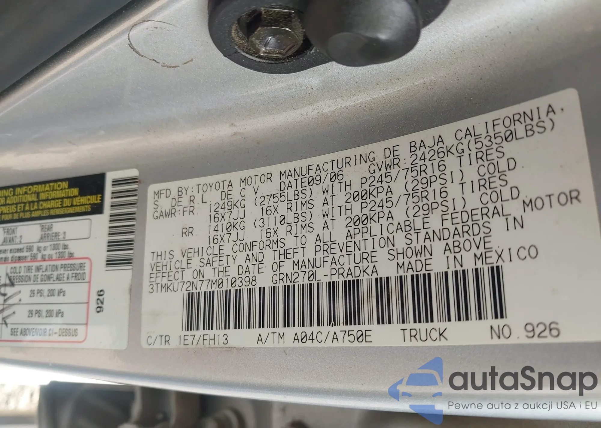LOT: 43127183 VIN: 3TMKU72N77M010398