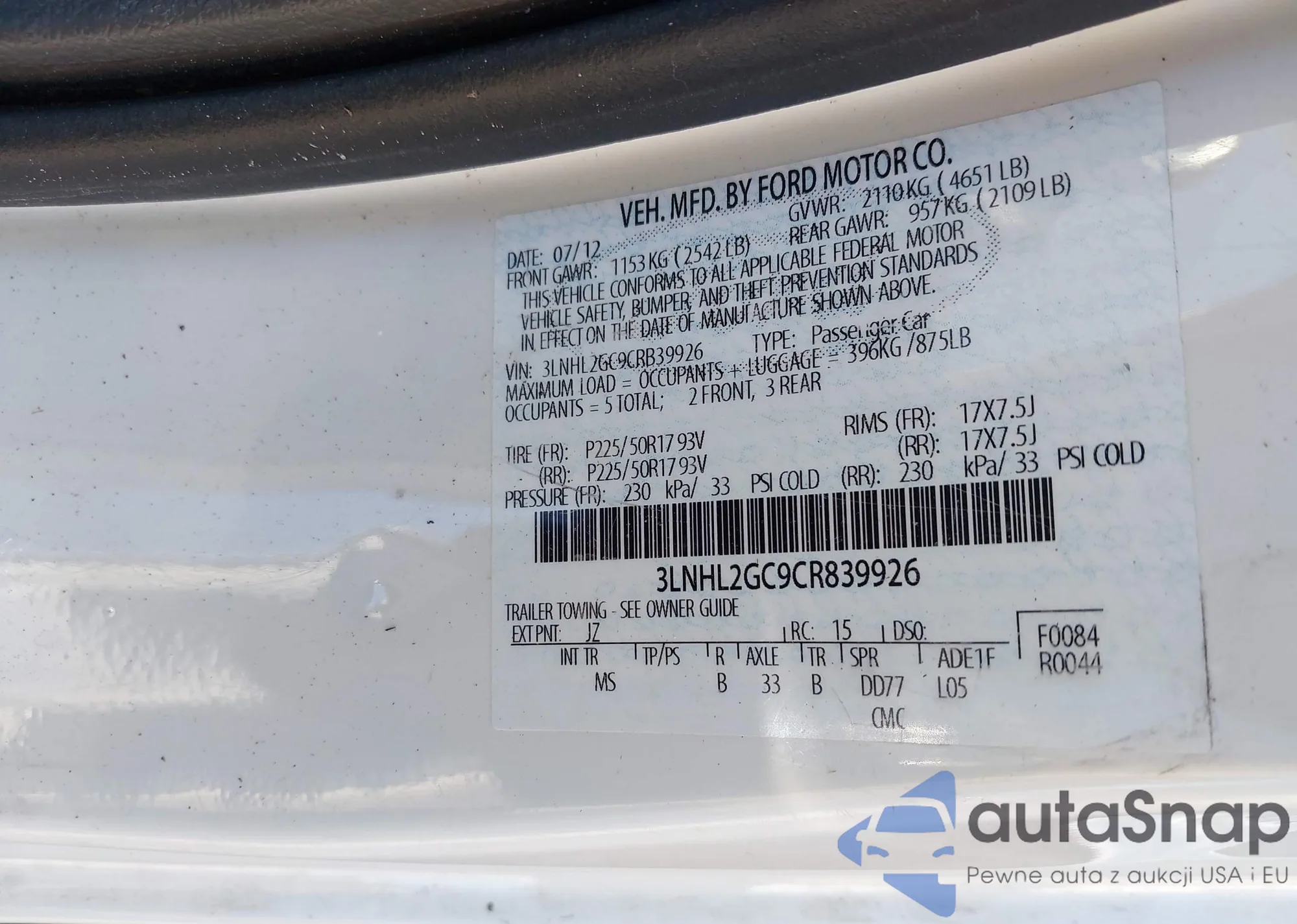 LOT: 43042336 VIN: 3FAHP0CGXCR404635