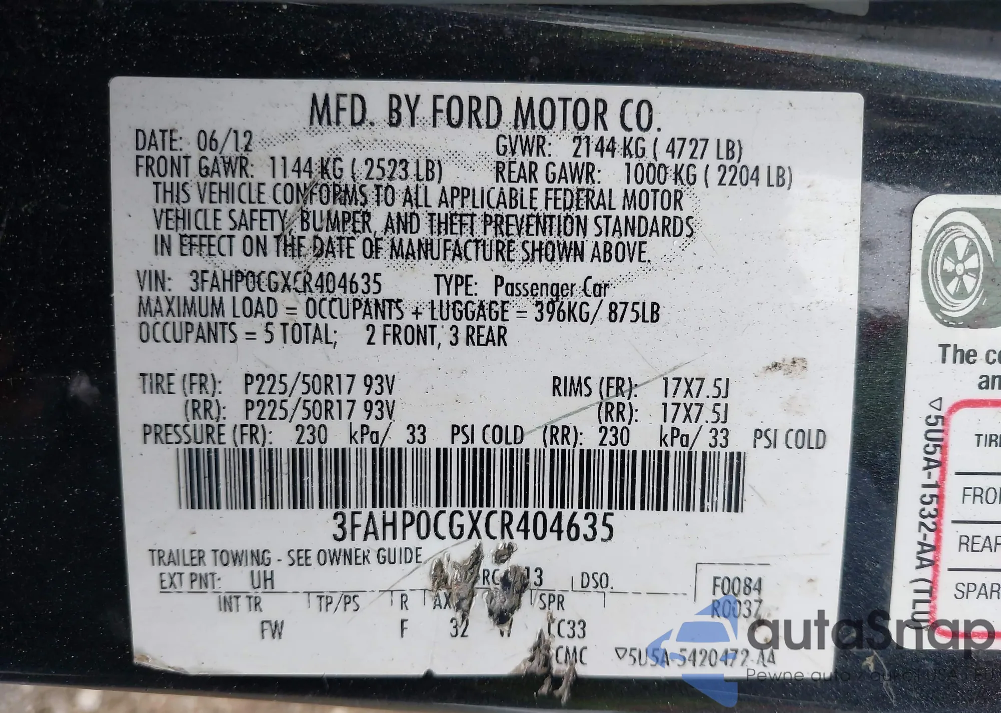 • VIN 3FAHP0CGXCR404635