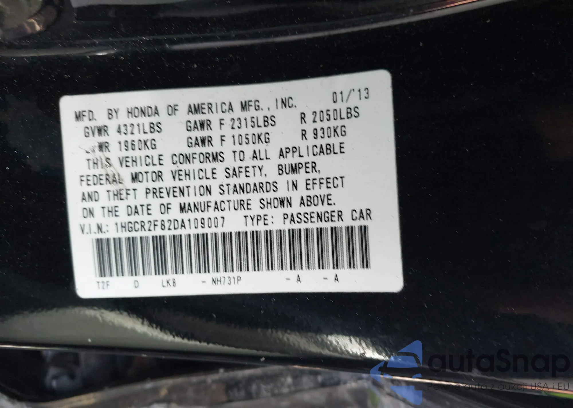 LOT: 43348162 VIN: 1HGCR2F82DA109007