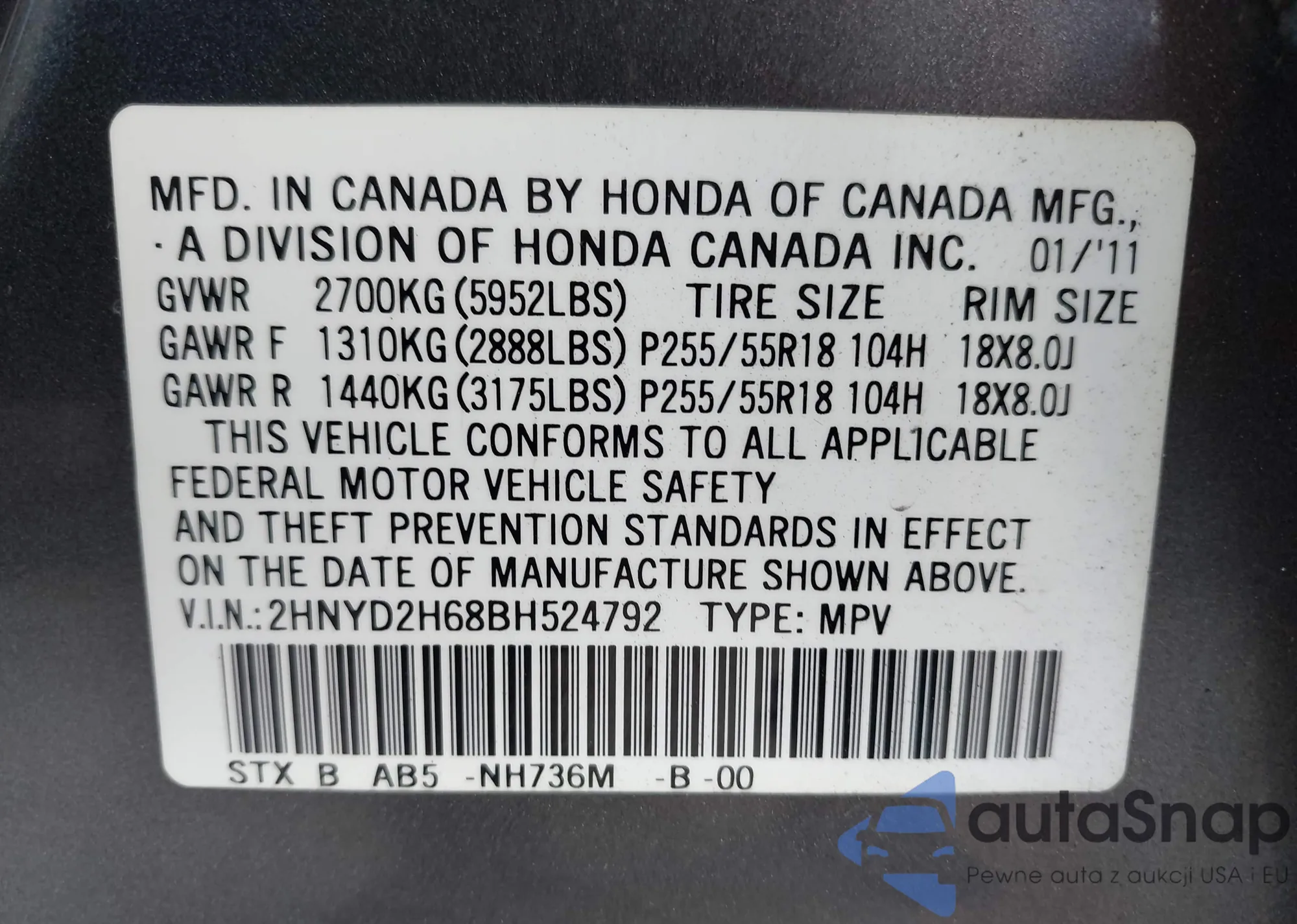 • VIN 2HNYD2H68BH524792