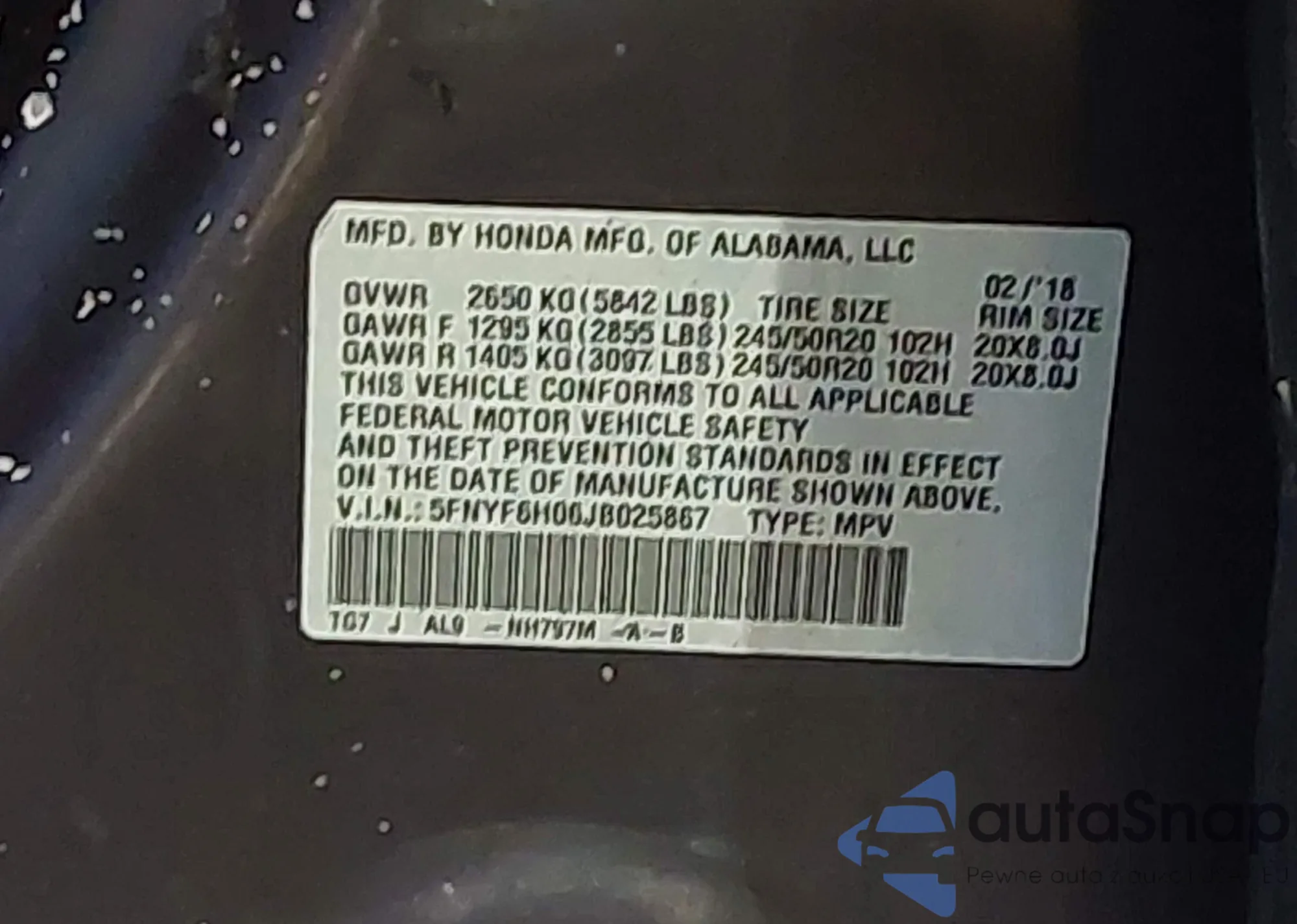 • VIN 5FNYF6H06JB025867