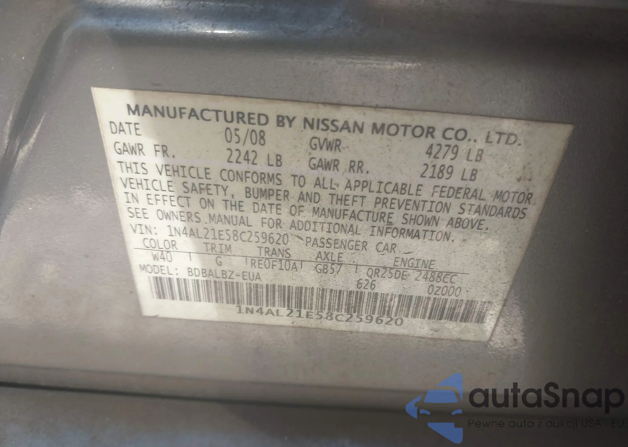 LOT: 43190106 VIN: 1N4AL21E58C259620
