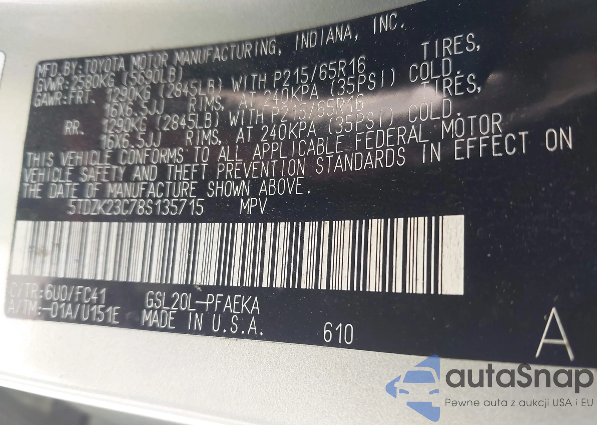 LOT: 43276227 VIN: 5TDZK23C78S135715