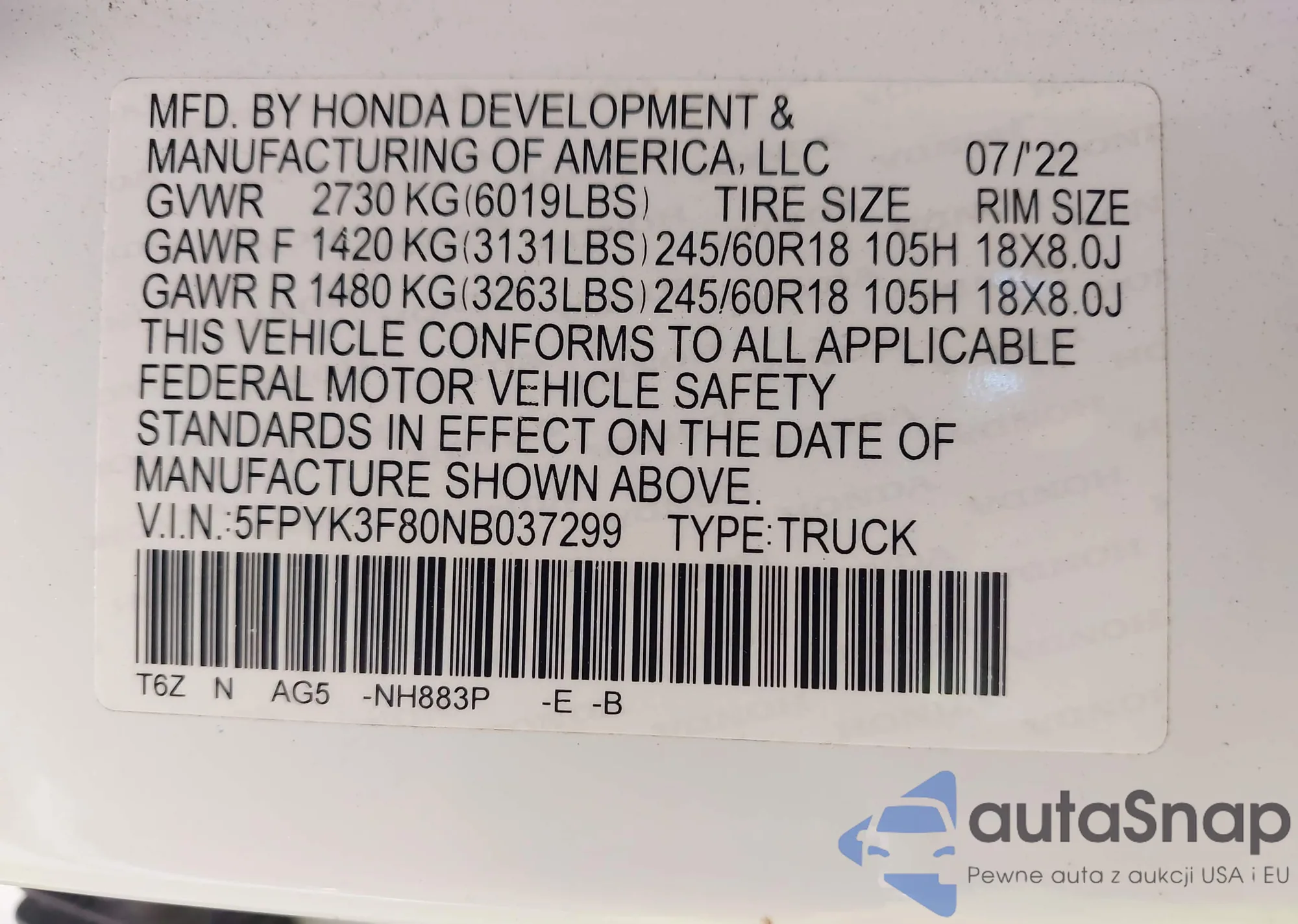• VIN 5FPYK3F80NB037299