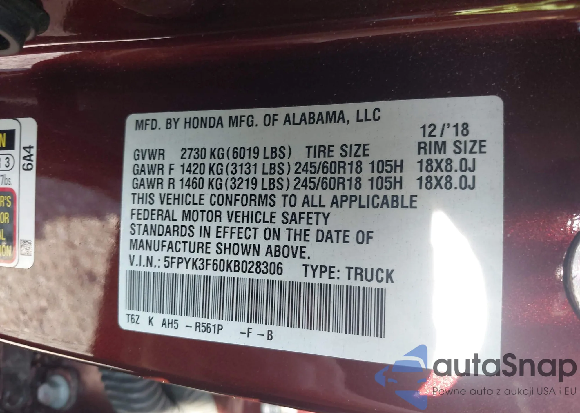 • VIN 5FPYK3F60KB028306
