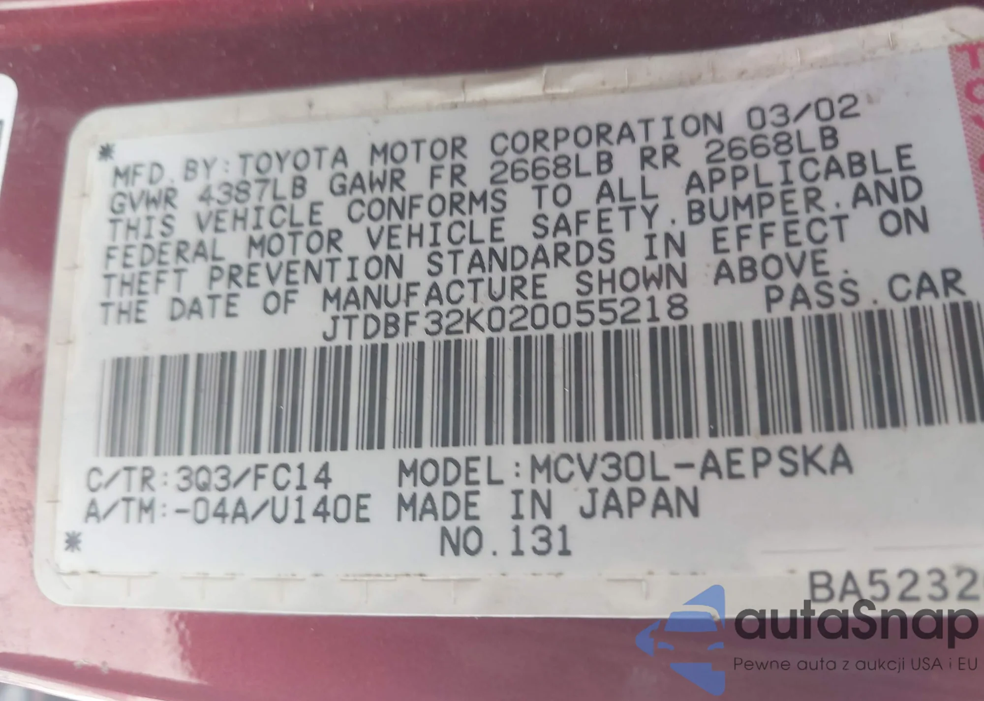 LOT: 43099586 VIN: JTDBF32K020055218