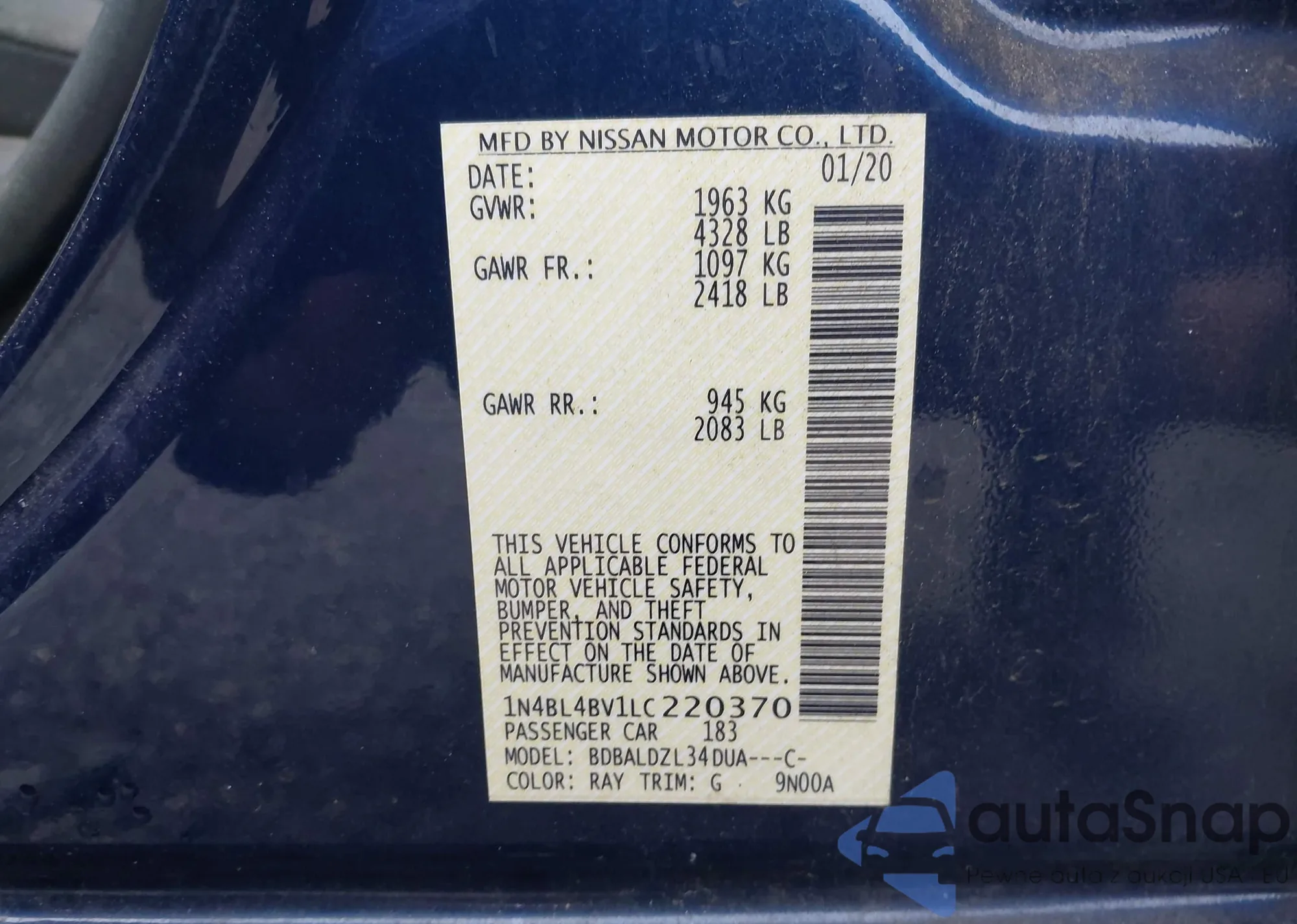 • VIN 1N4BL4BV1LC220370