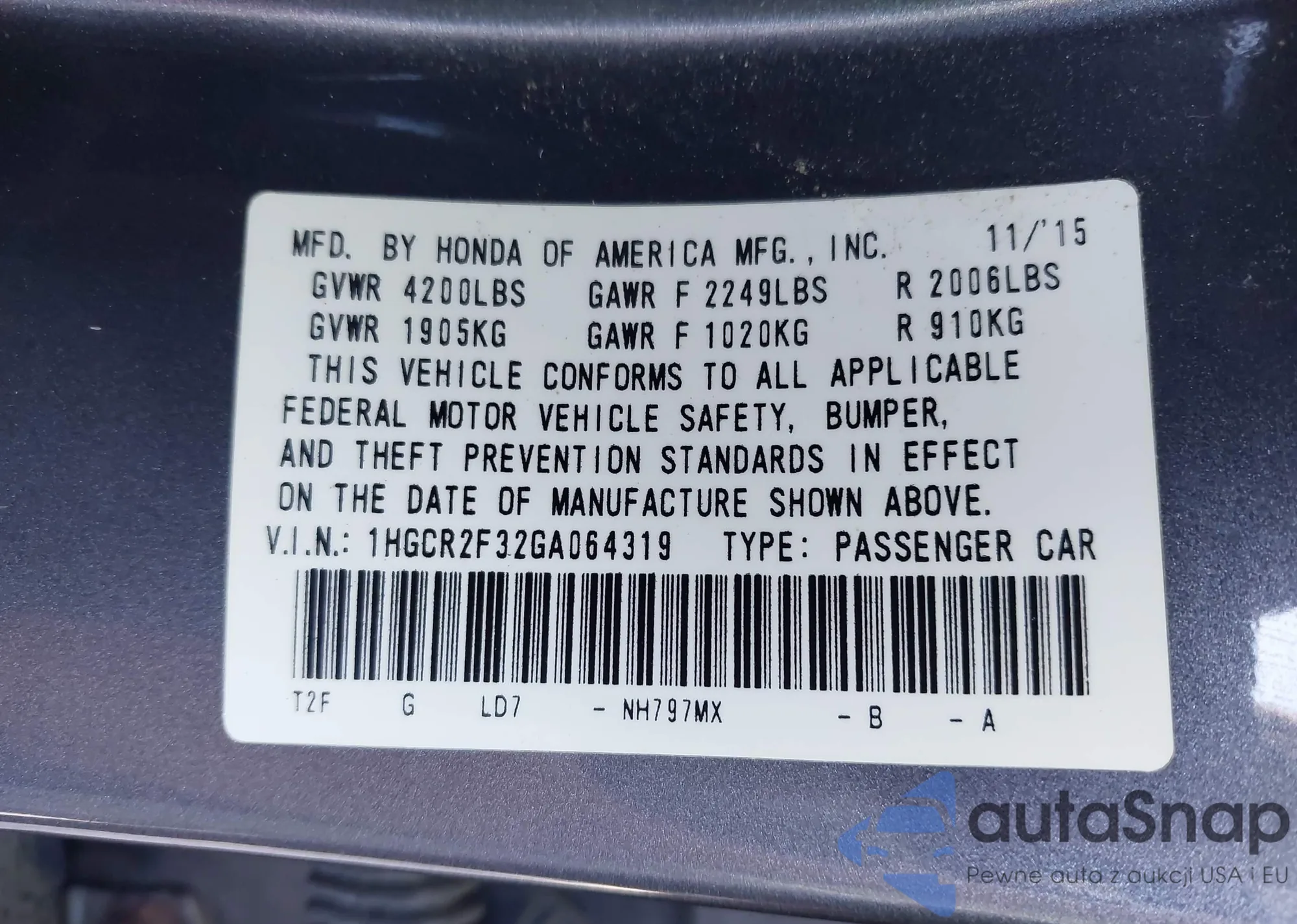 LOT: 43263615 VIN: 1HGCR2F32GA064319