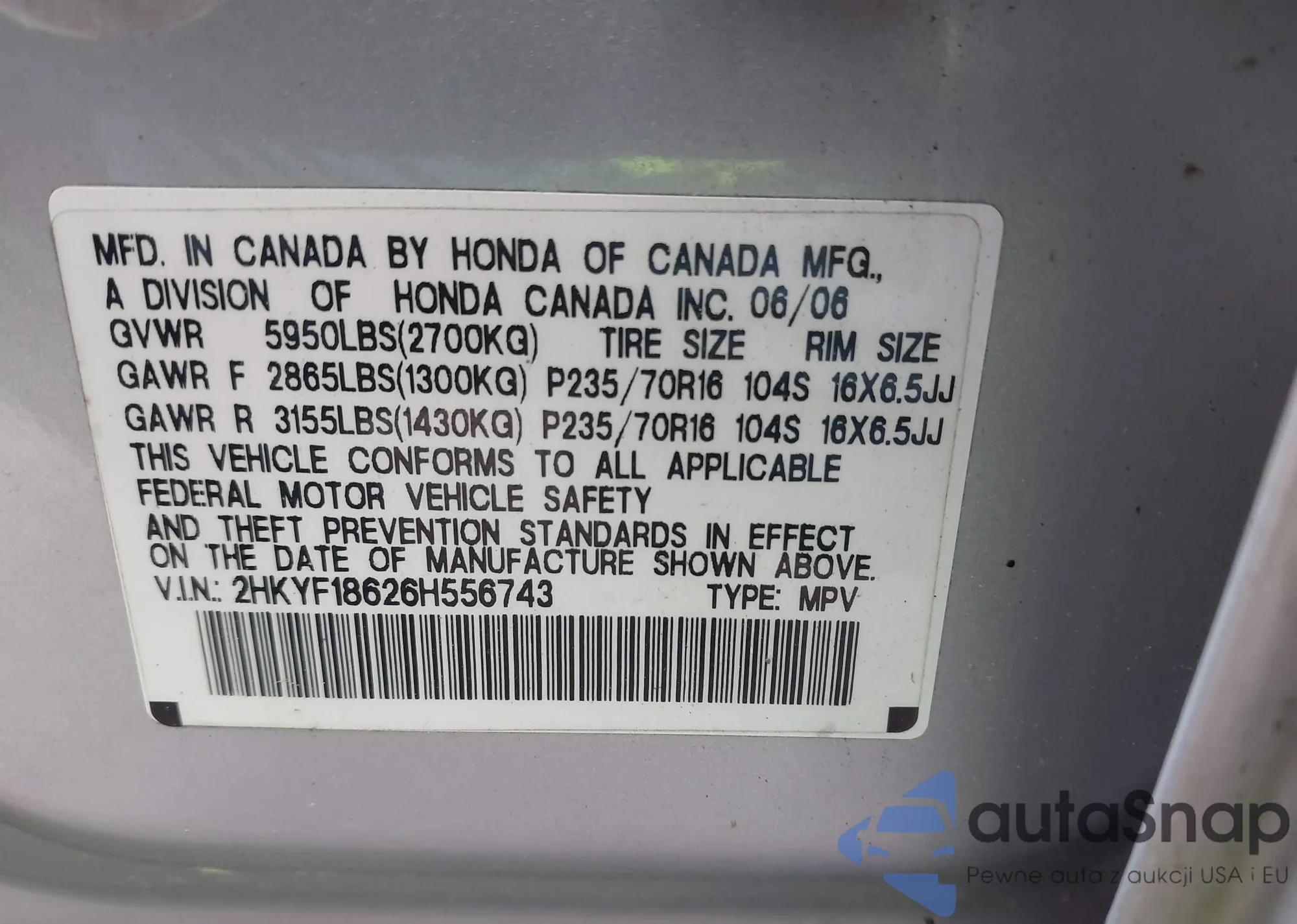 LOT: 42735574 VIN: 2HKYF18626H556743