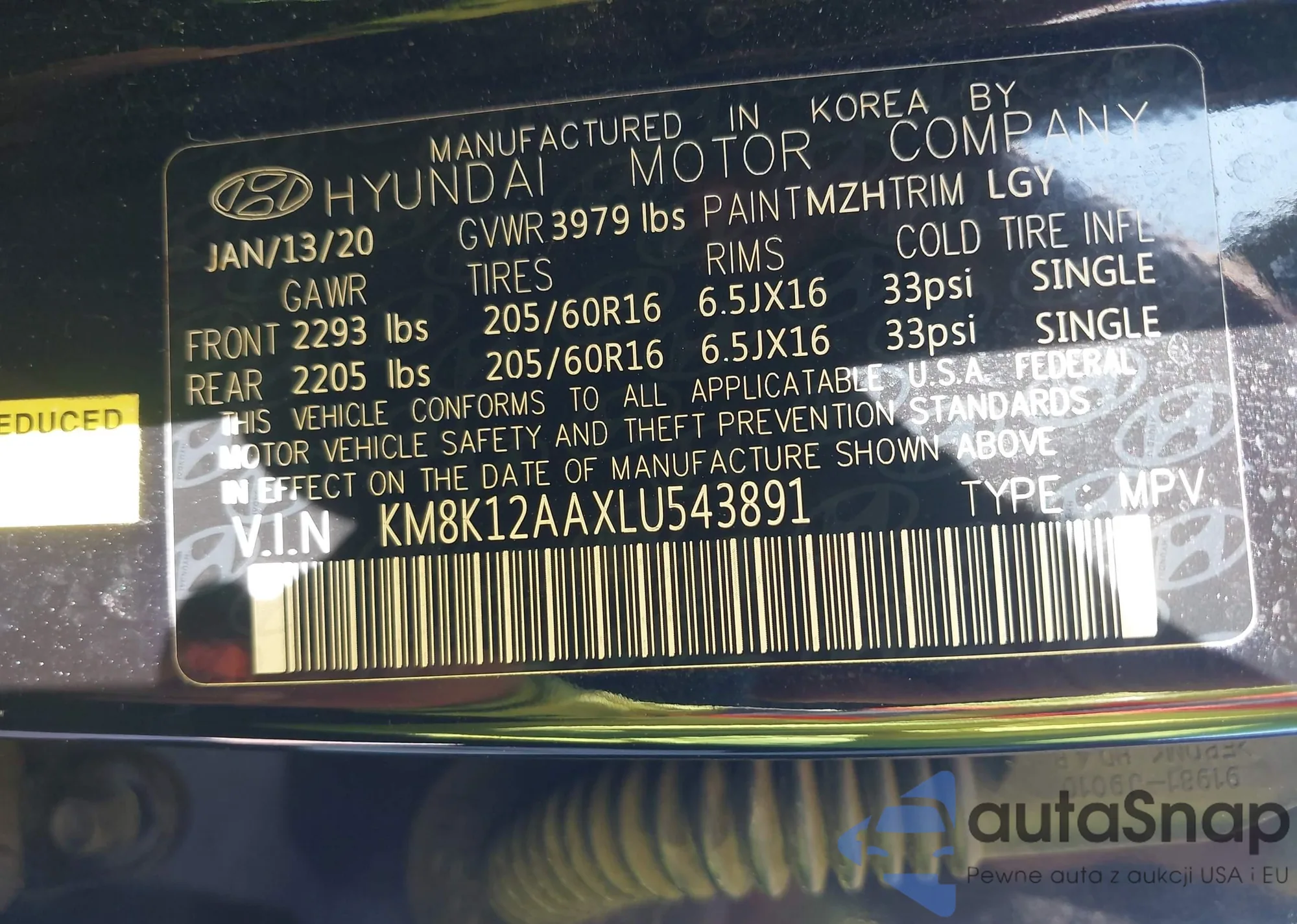LOT: 43021995 VIN: KM8K12AAXLU543891