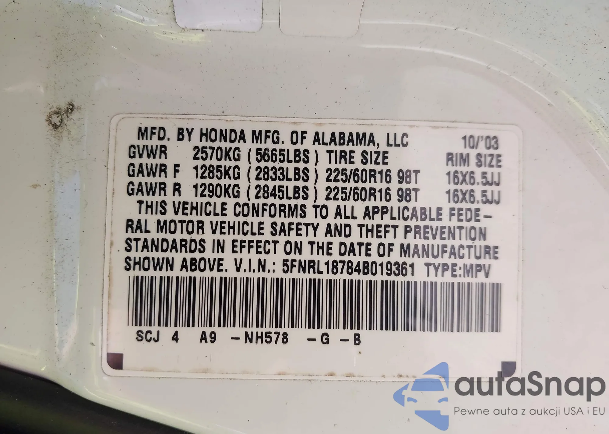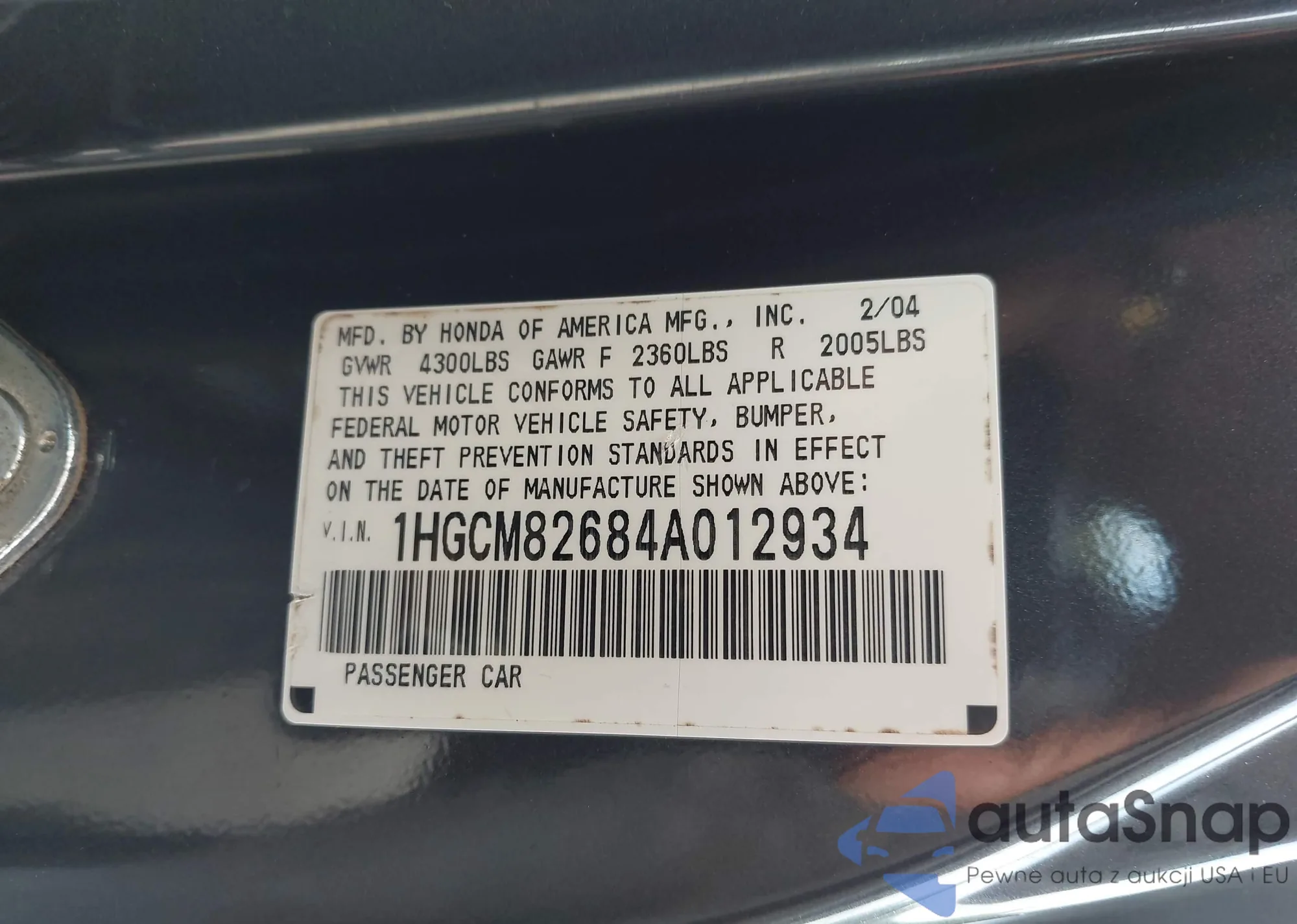 LOT: 43074181 VIN: 1HGCM82684A012934