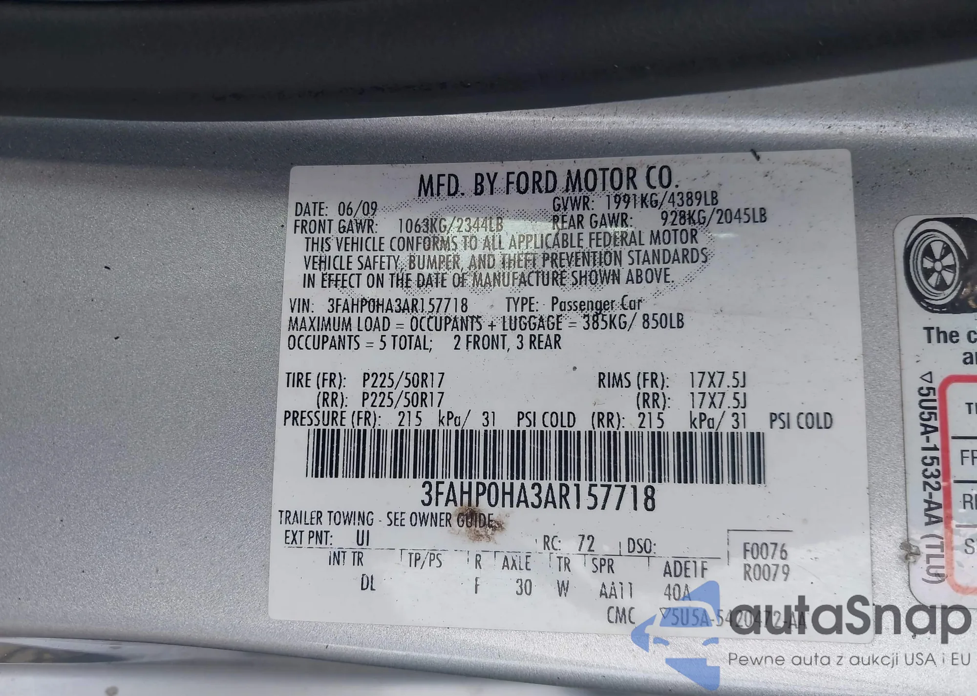 • VIN 3FAHP0HA3AR157718