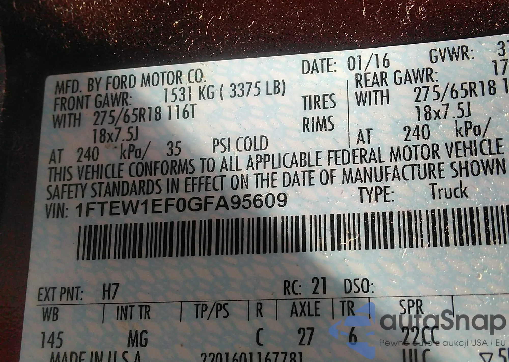 LOT: 43168269 VIN: 1FTEW1EF0GFA95609